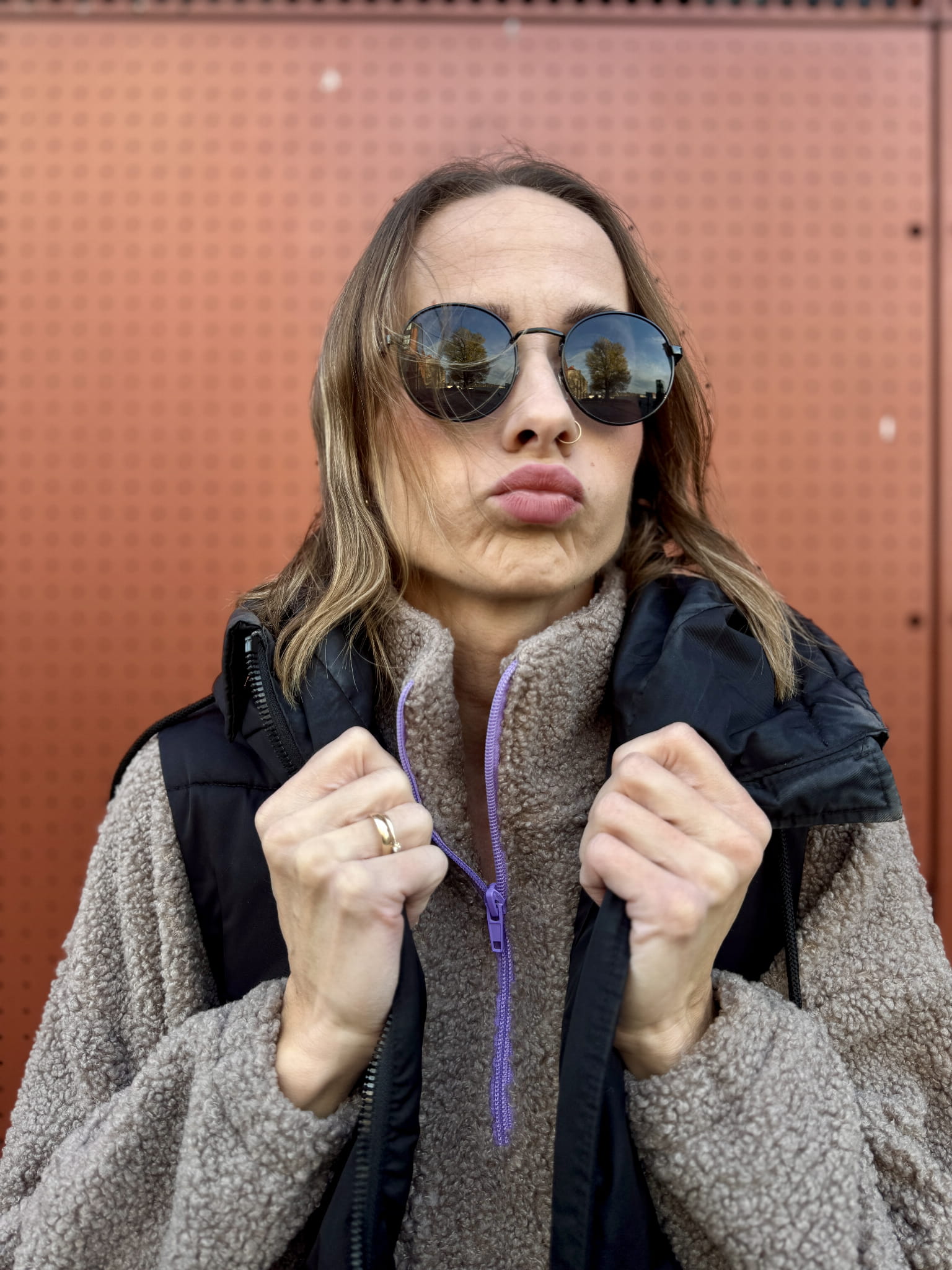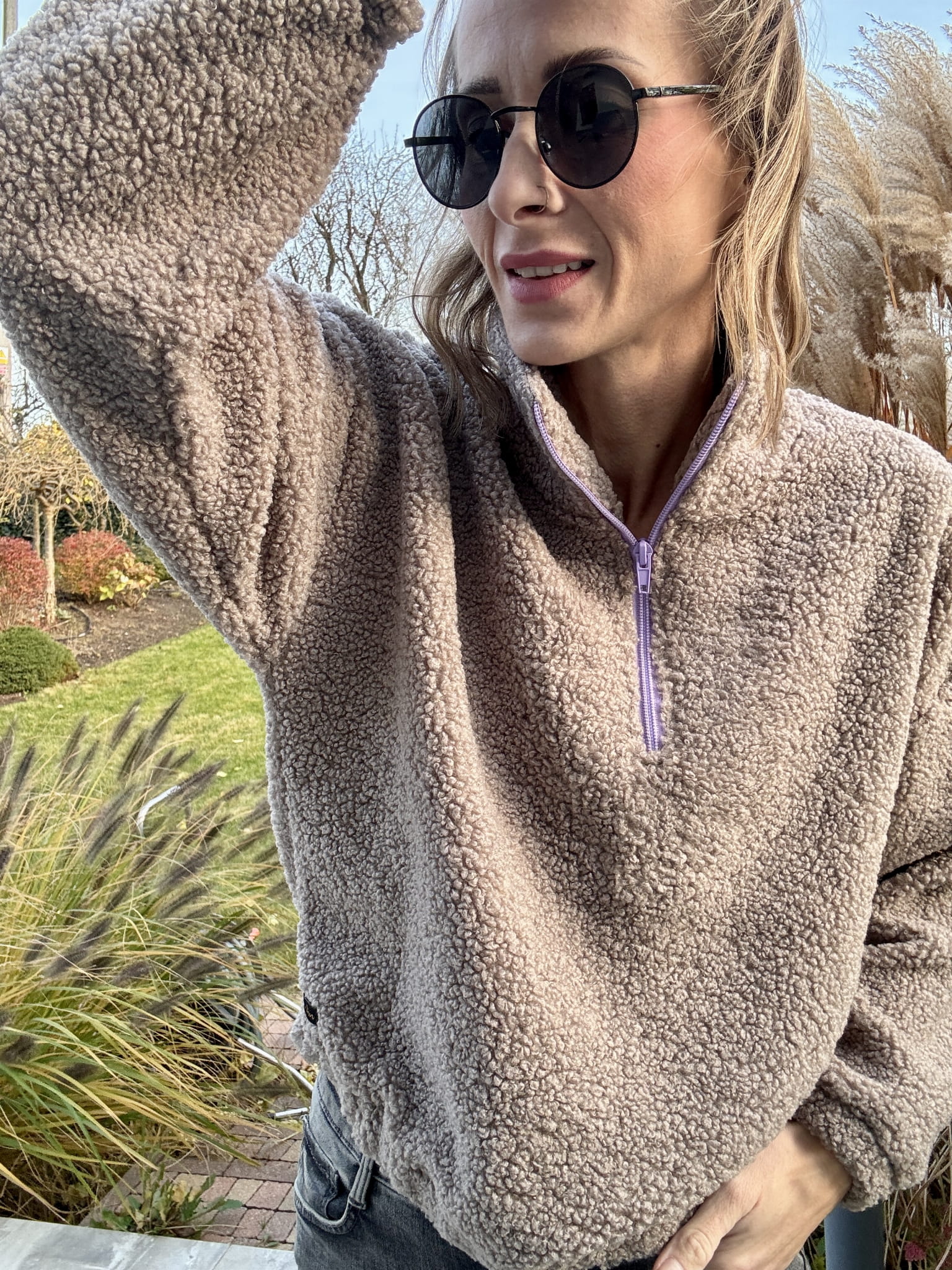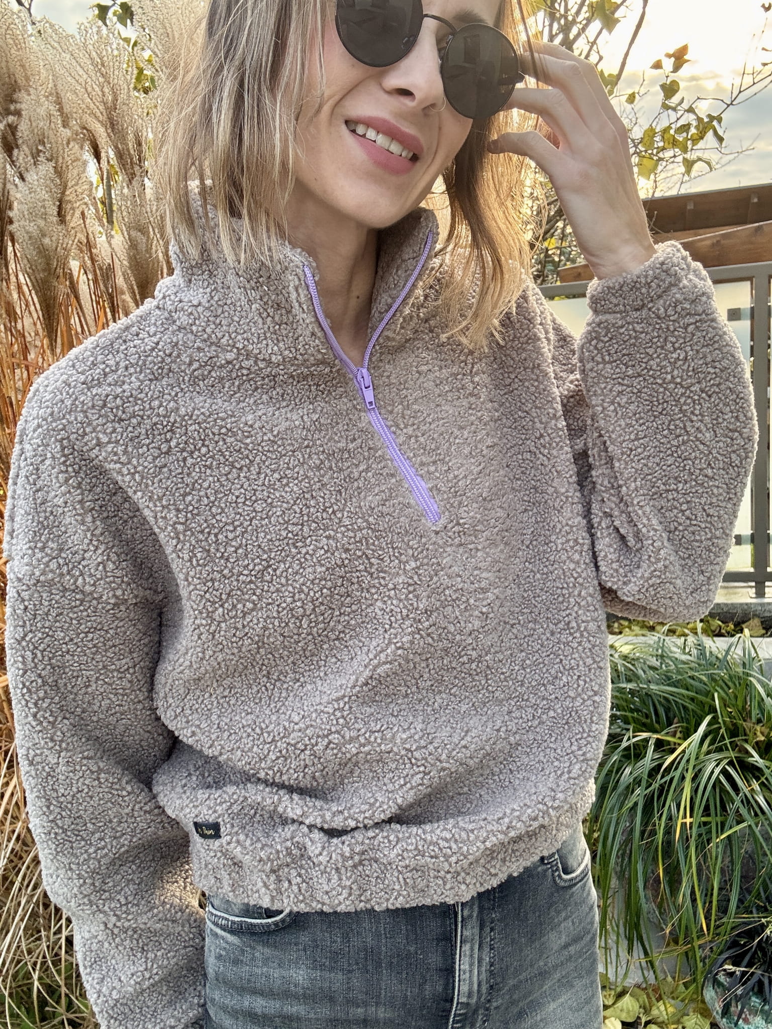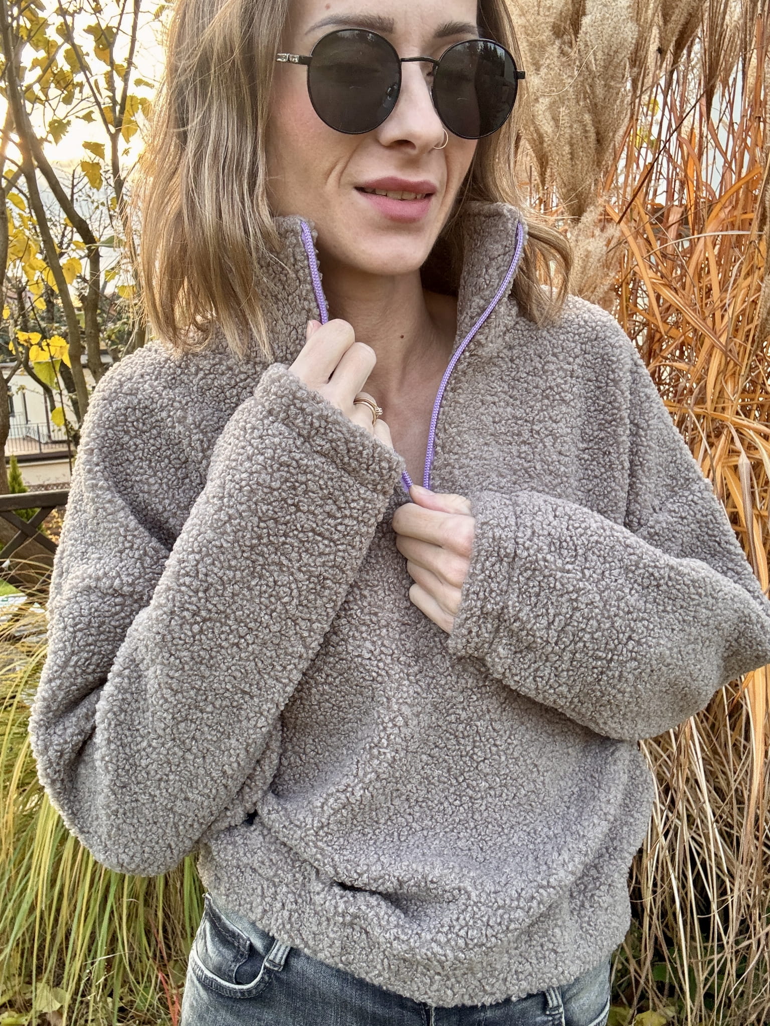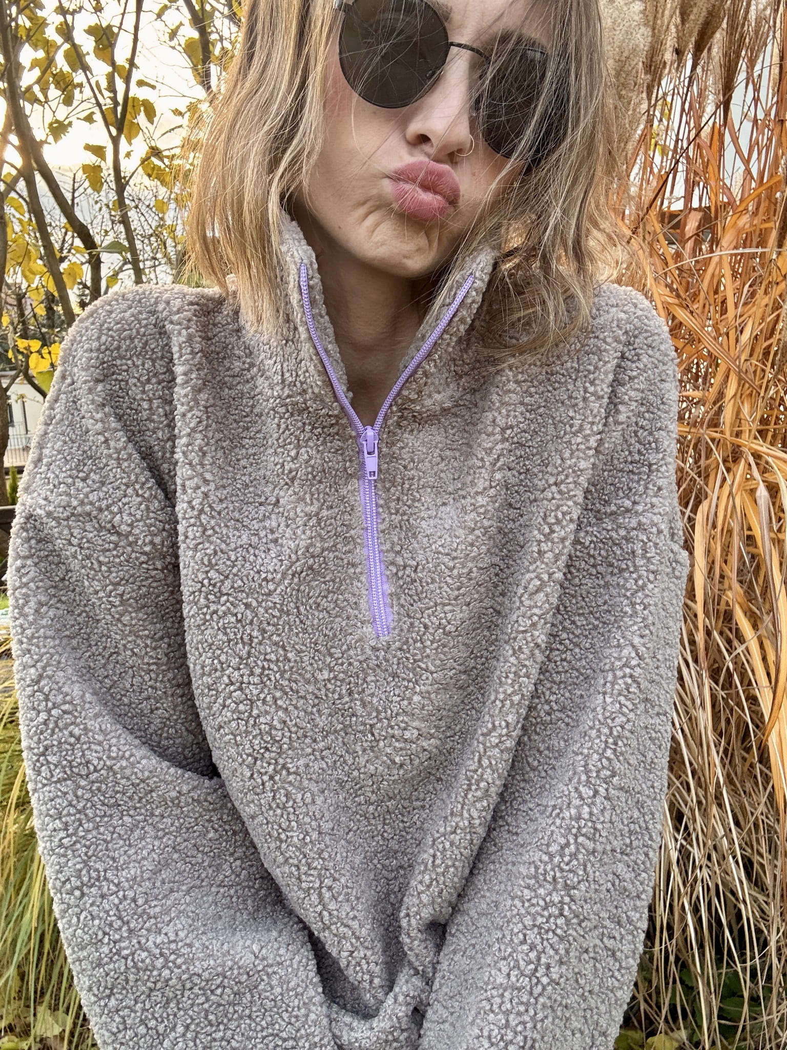 Ciepły, głęboki beżowy odcień i subtelny fioletowy zamek tworzą duet, który trudno zapomnieć. Stójka otula szyję, a luźny krój pozwala Ci poczuć się swobodnie, niezależnie od sytuacji. To futerko nie tylko grzeje – ono buduje nastrój.