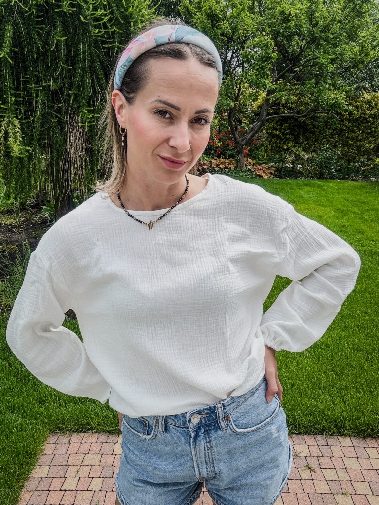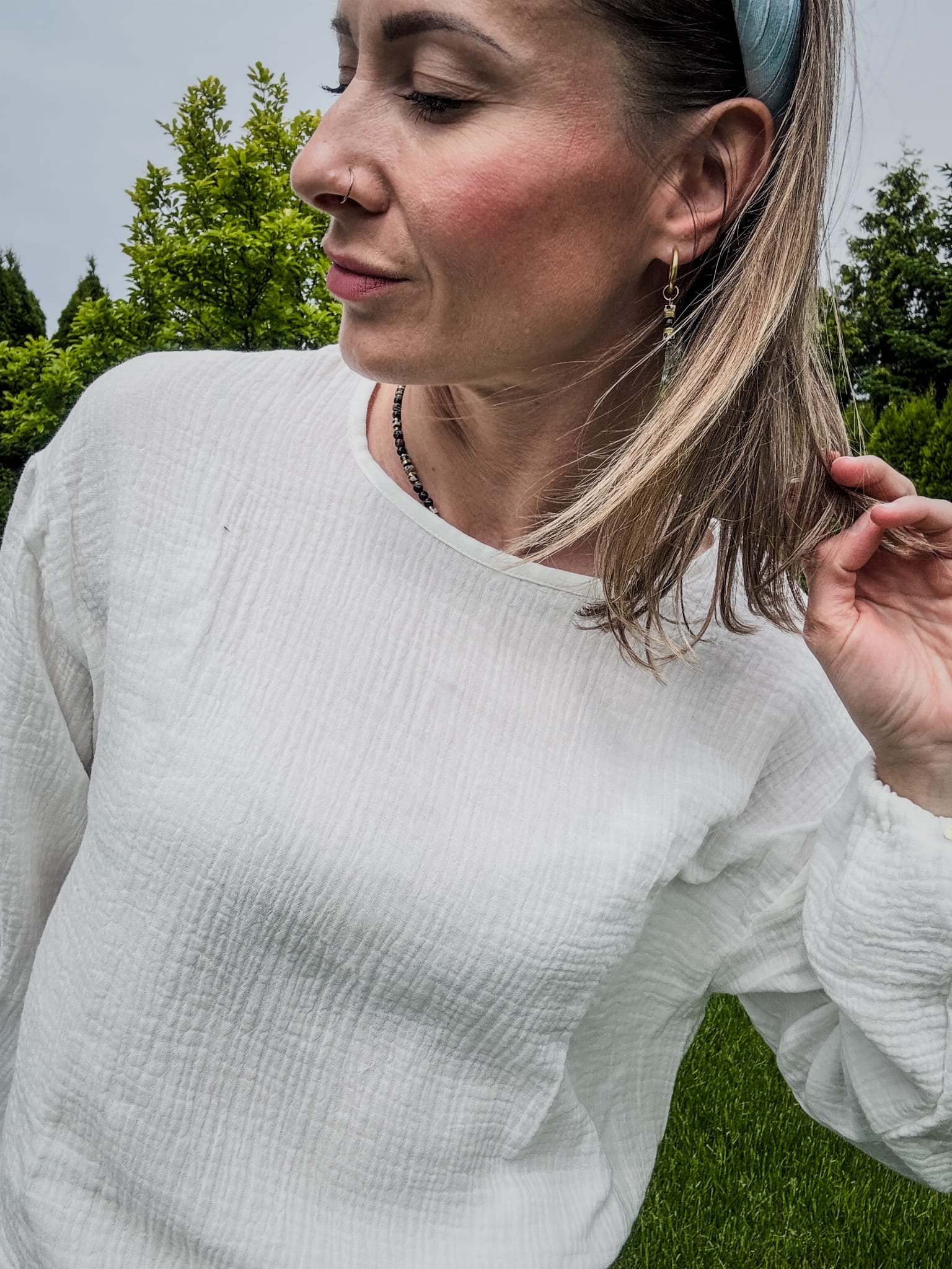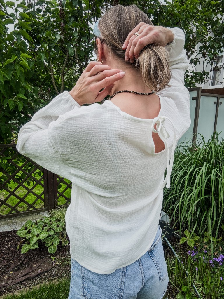Koszula ma luźny, niewymuszony krój z obniżoną linią ramion i delikatnie bufiastym rękawem zakończonym gumką, który nadaje sylwetce lekkości. Charakterystycznym detalem jest subtelne wiązanie z tyłu – dodaje lekkości, a jednocześnie pozwala dopasować koszulę do siebie. Dekolt z tyłu z delikatnym rozcięciem układa się miękko, tworząc kobiecą, ale naturalną linię.