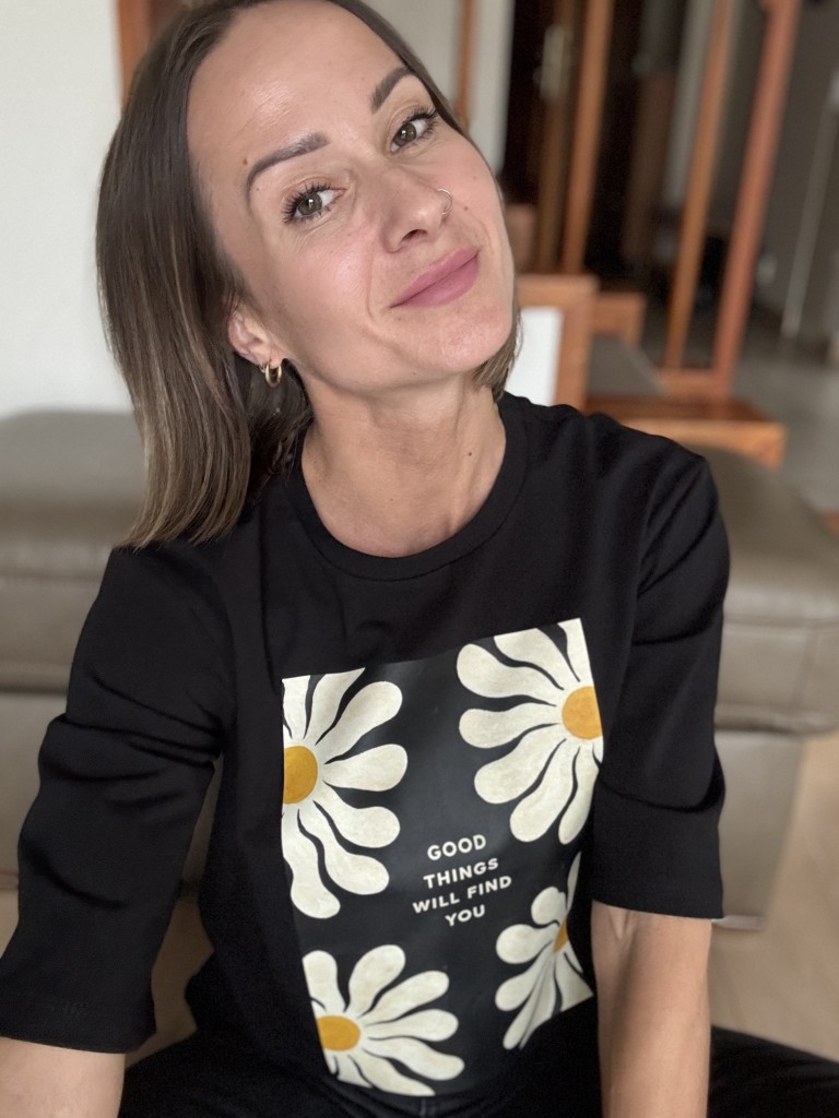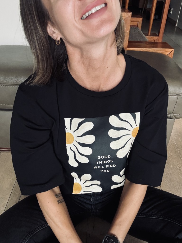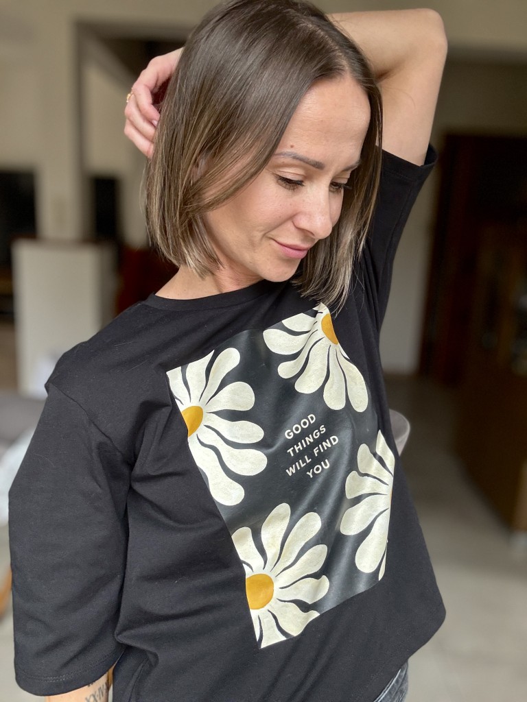Czarna koszulka damska Mrs. Thin z nadrukiem białych stokrotek i hasłem „good things will find you” to współczesna baza z charakterem. Kontrastowy print przyciąga uwagę, ale pozostaje subtelny — daje lekkość i pozytywny przekaz bez przesady. To t-shirt, który dobrze odnajduje się w codziennych stylizacjach i nie traci na aktualności.