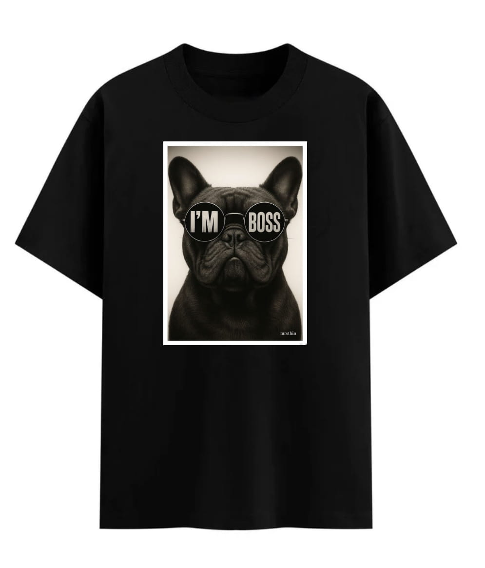 Czarna koszulka męska z buldogiem „I’m Boss” to mocny, minimalistyczny projekt z charakterem. Nadruk A4 na środku robi robotę — buldog w okularach mówi jasno, kto tu rozdaje karty.