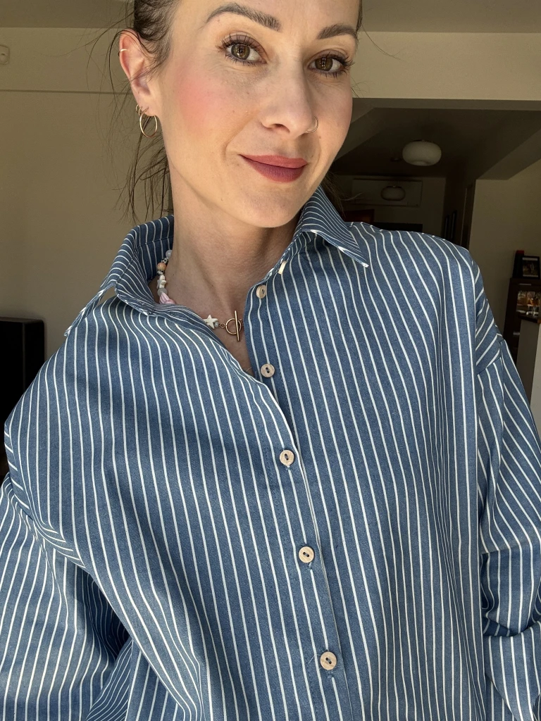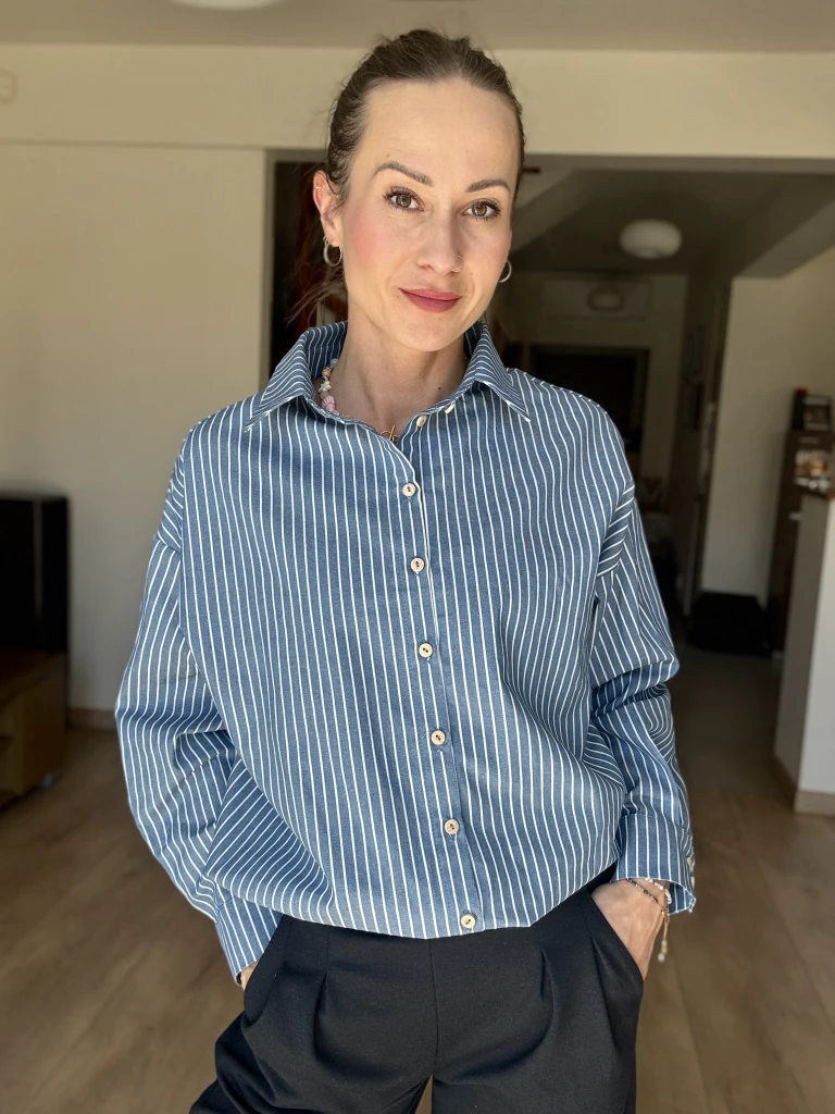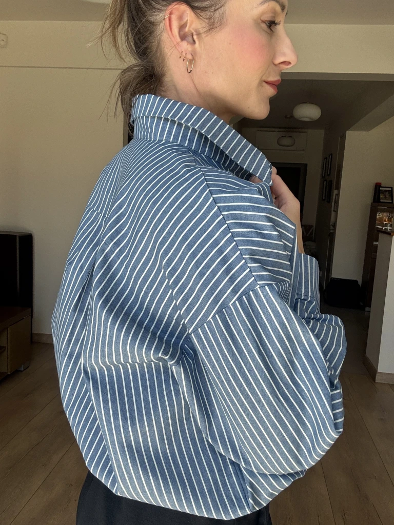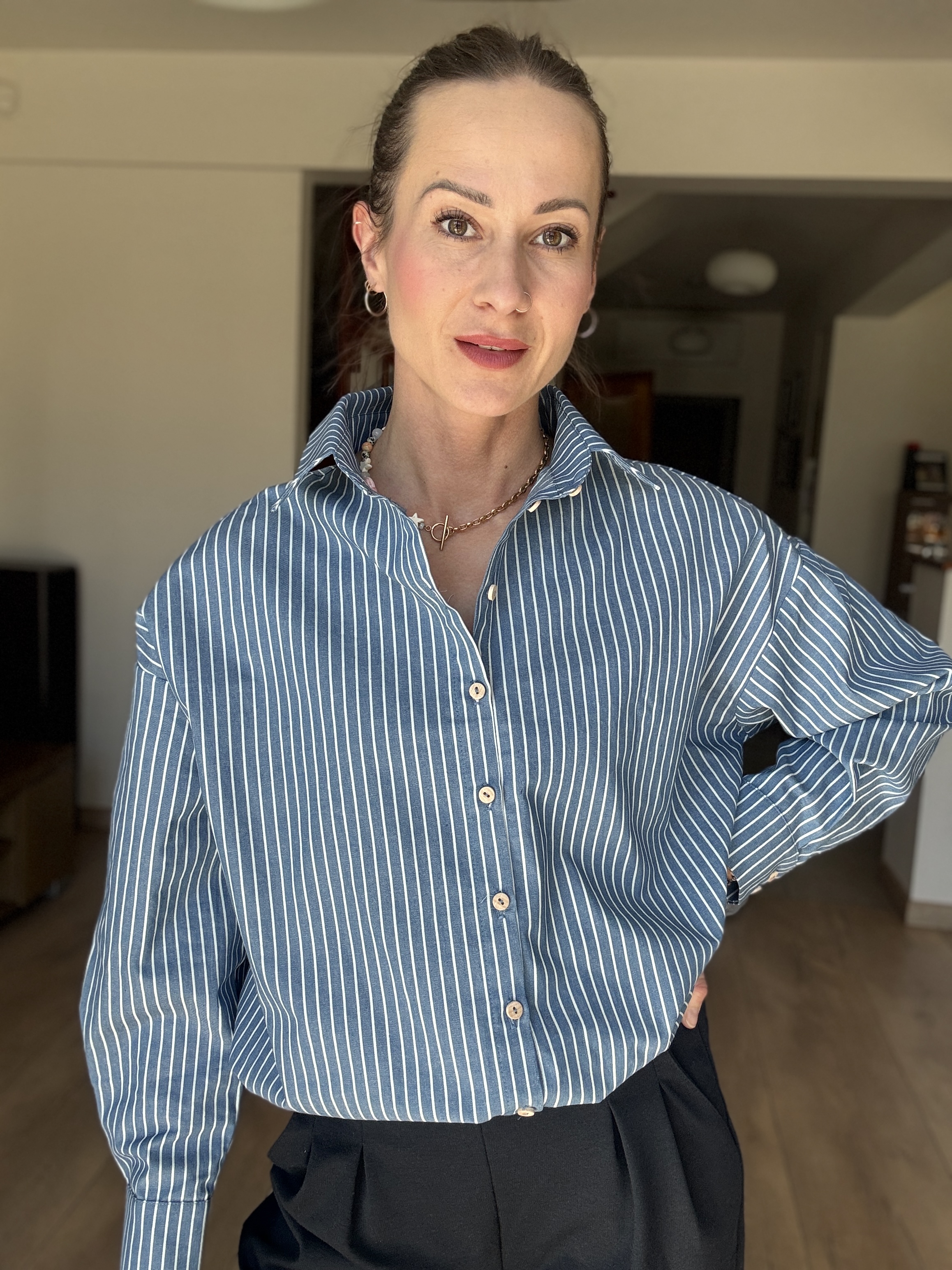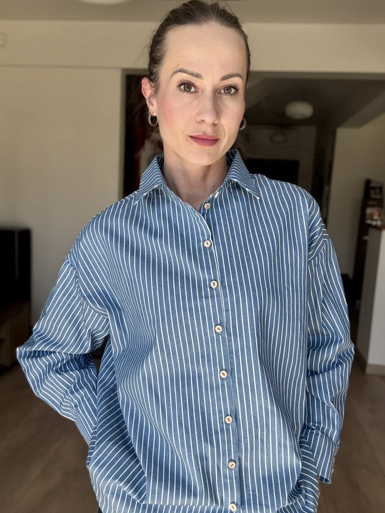 Luźny krój oversize z obniżoną linią ramion daje swobodę i naturalnie układa się na sylwetce. To koszula, którą możesz nosić na wiele sposobów — jako bazę stylizacji lub warstwę wierzchnią.