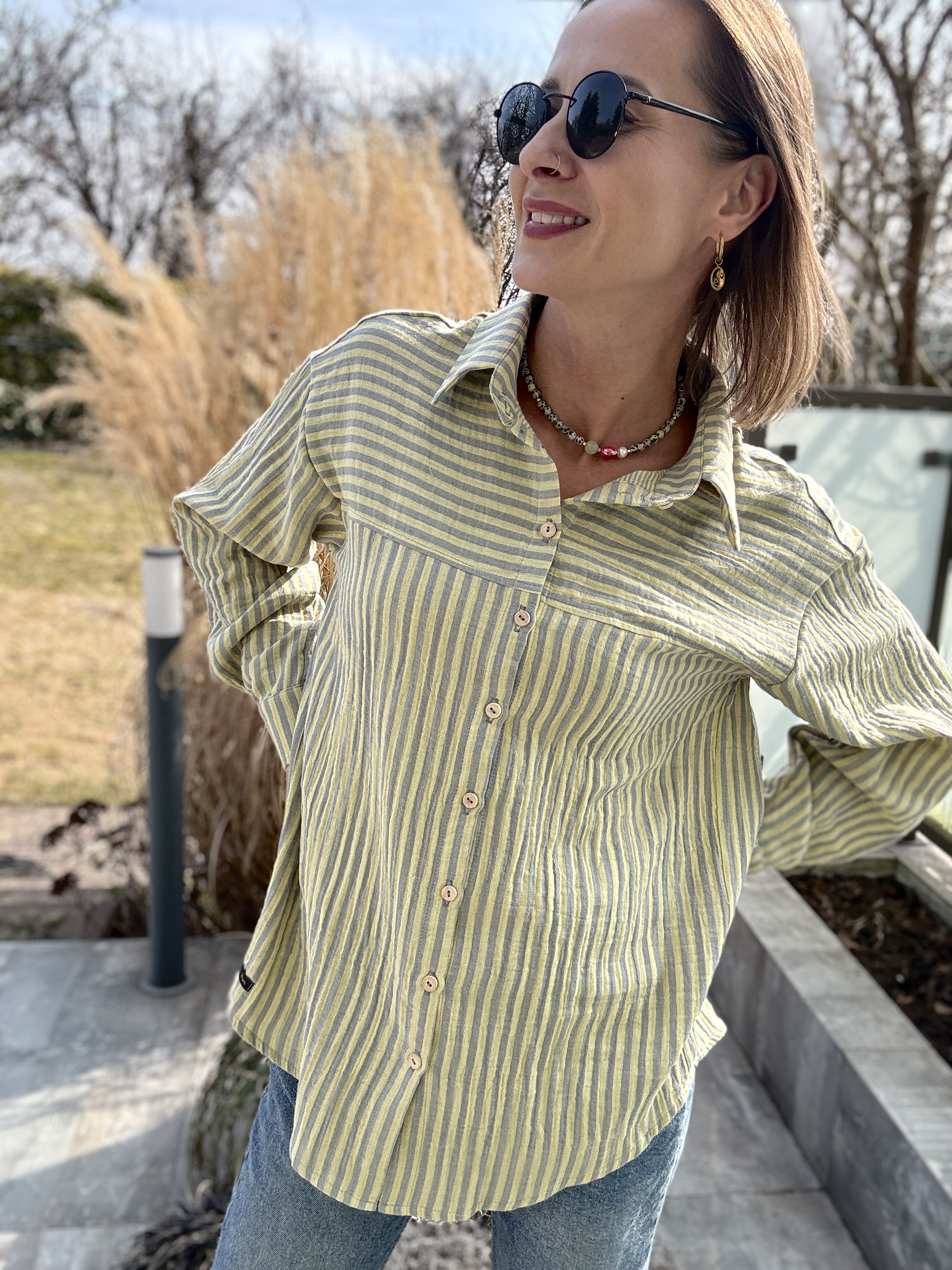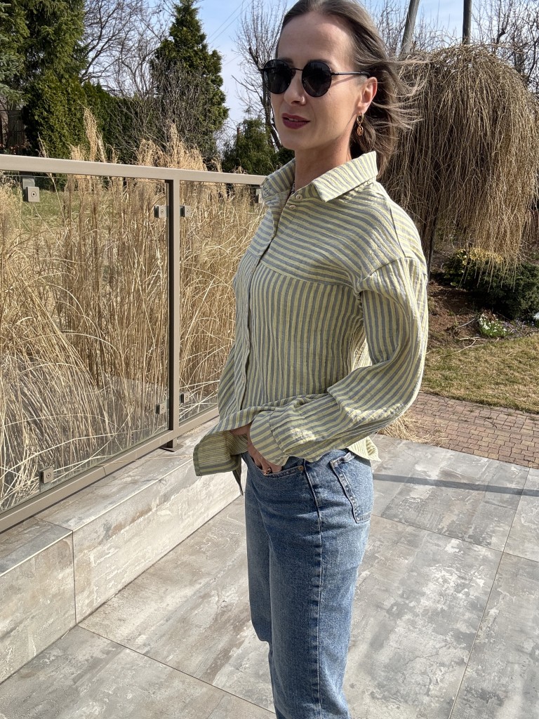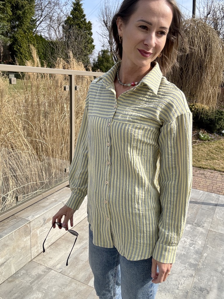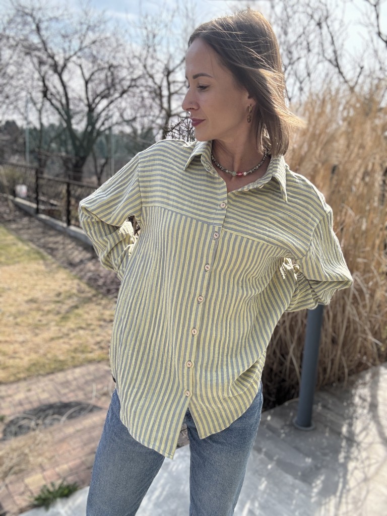 Damska koszula muślinowa w cytrynowe paski od Mrs. Thin to projekt, w którym forma i tkanina pracują razem. Lekki, oddychający muślin nadaje sylwetce naturalnej płynności, a świeży, cytrynowy rytm pasków wprowadza subtelny akcent koloru — wyważony, ale zauważalny.