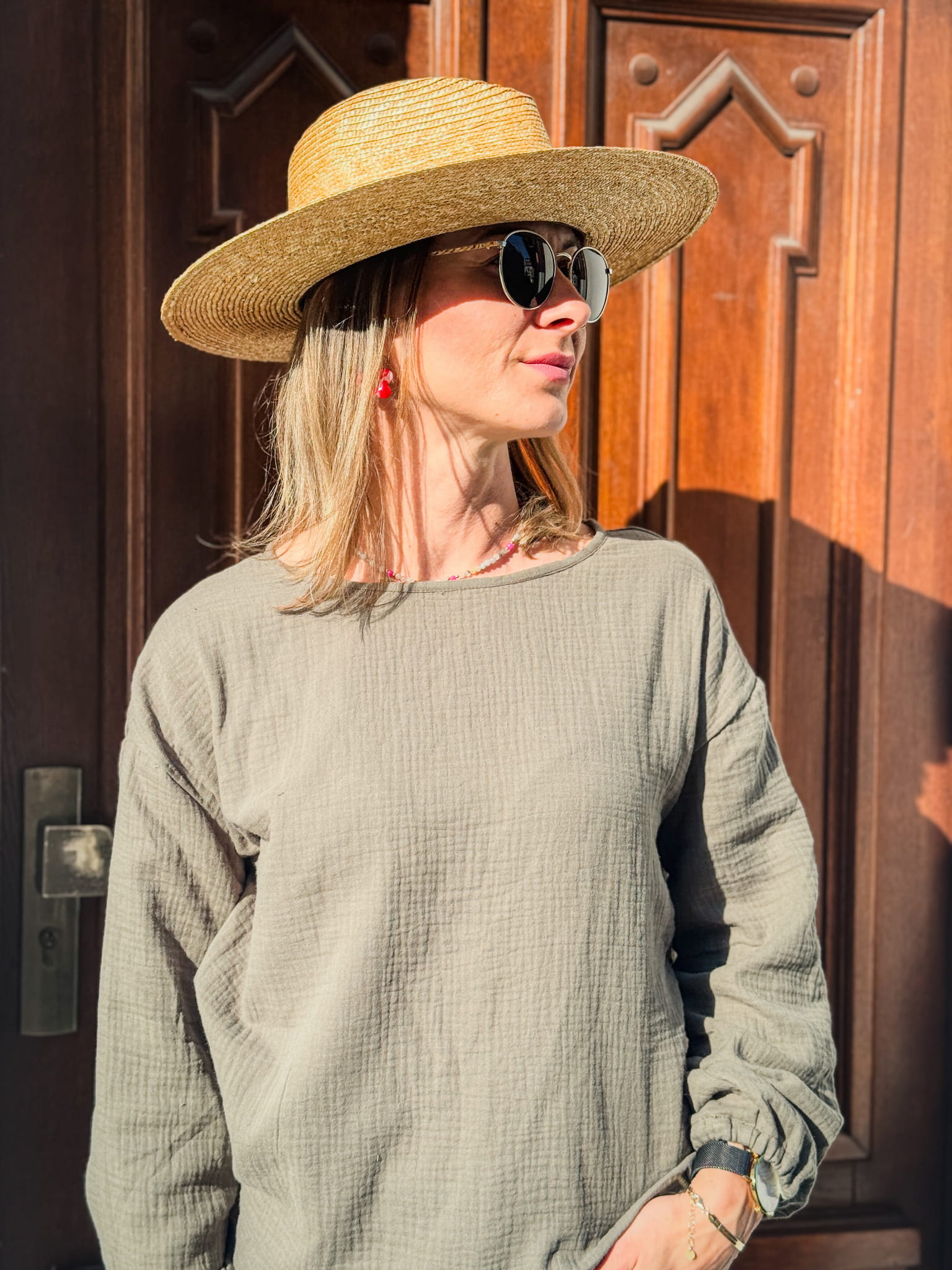 Kolor khaki to spokojna, ziemista baza, która pasuje do wielu typów urody i świetnie łączy się z naturalnymi kolorami – beżem, bielą, czernią, jeansem czy złotą biżuterią. Sprawdzi się przez cały rok – latem z szortami, jesienią z kardiganem.