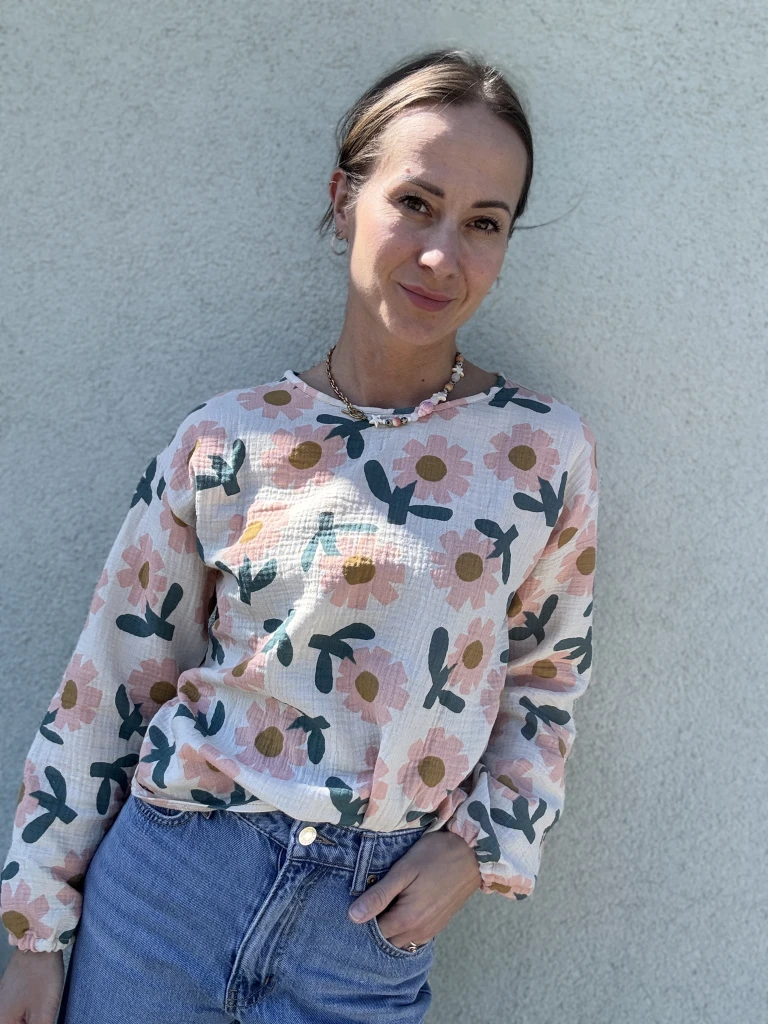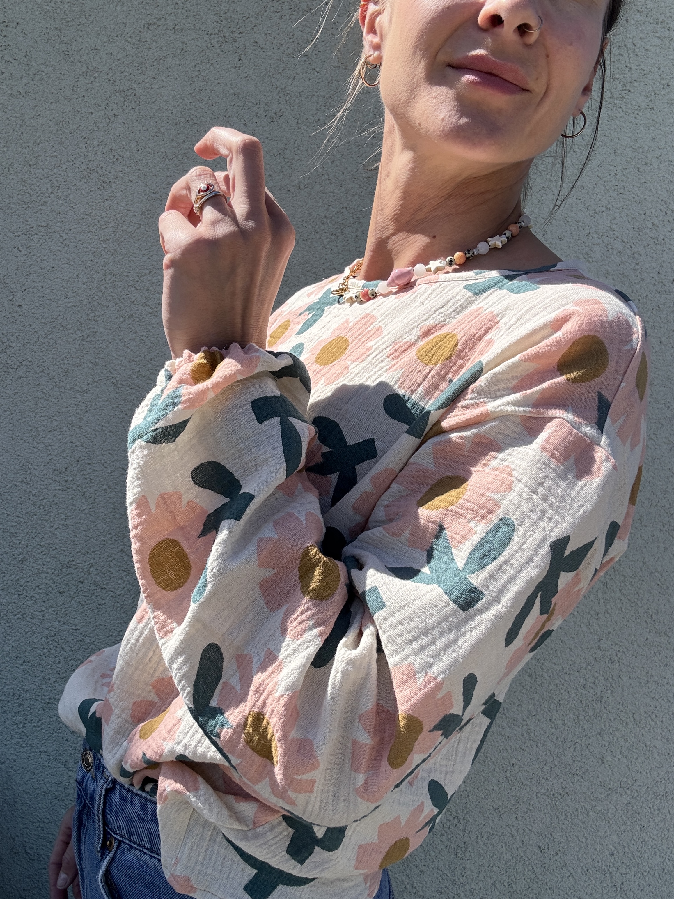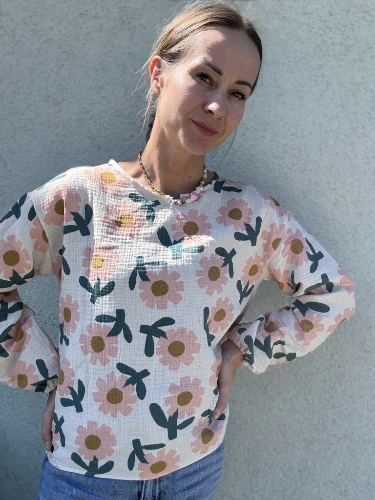 Lekka, naturalna i swobodna w formie — ta koszula muślinowa w słomkowym odcieniu, ozdobiona delikatnym, losowym wzorem kwiatów, łączy wygodę z subtelną kobiecością. To model, który dobrze wpisuje się w codzienny rytm, ale zostaje w garderobie na dłużej.