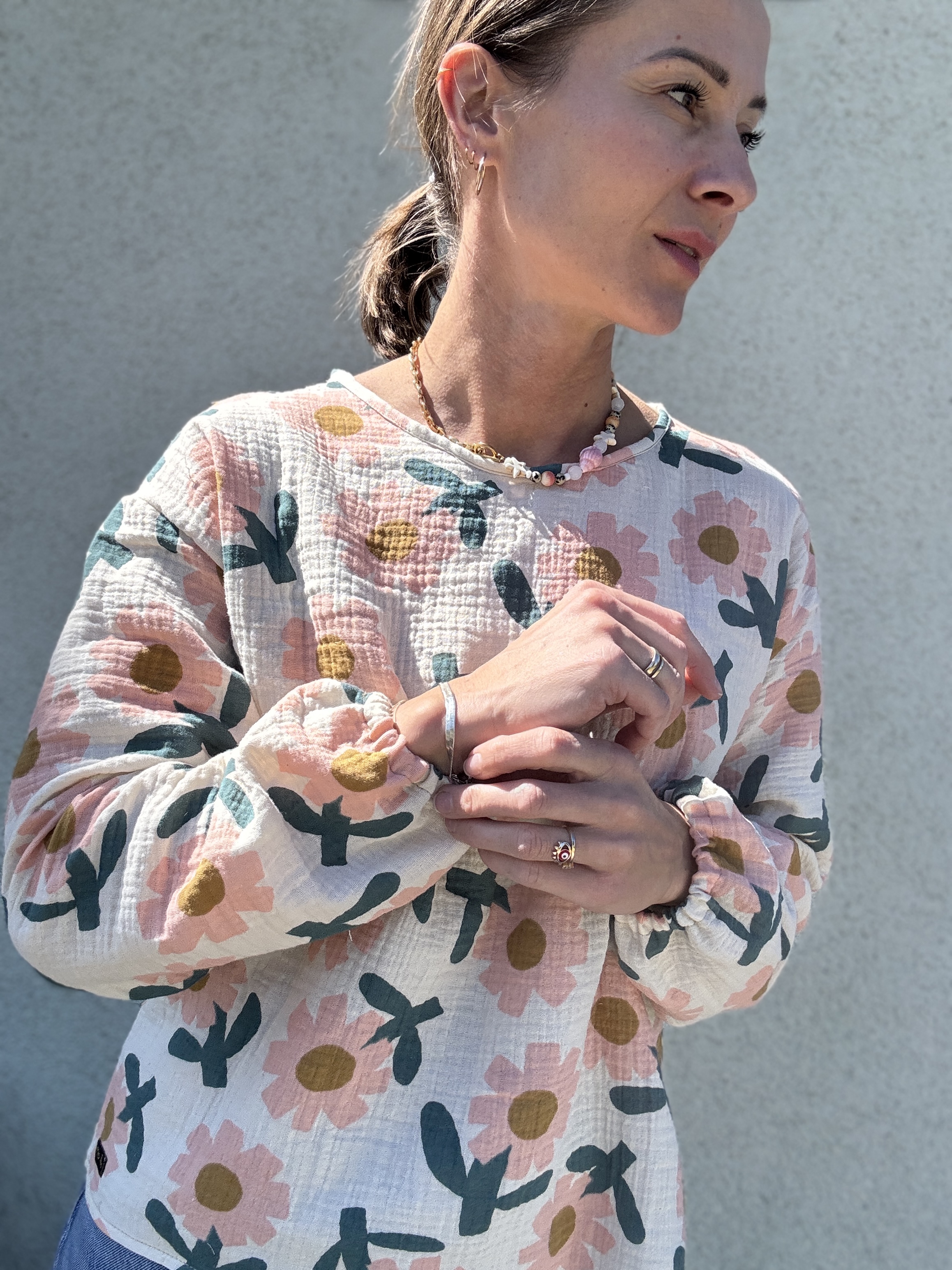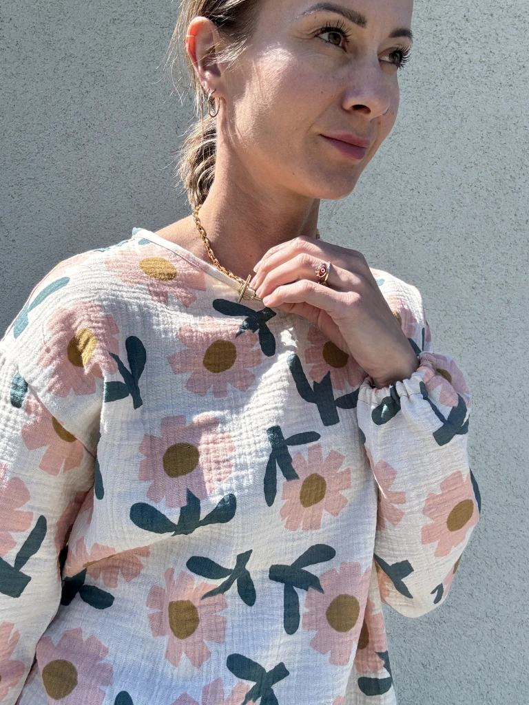 Uszyta z organicznego muślinu bawełnianego (100% bawełna), jest miękka, przewiewna i przyjemna dla skóry. Naturalna tkanina oddycha i sprawdza się o każdej porze roku — latem daje lekkość, a w chłodniejsze dni dobrze współgra z warstwami.