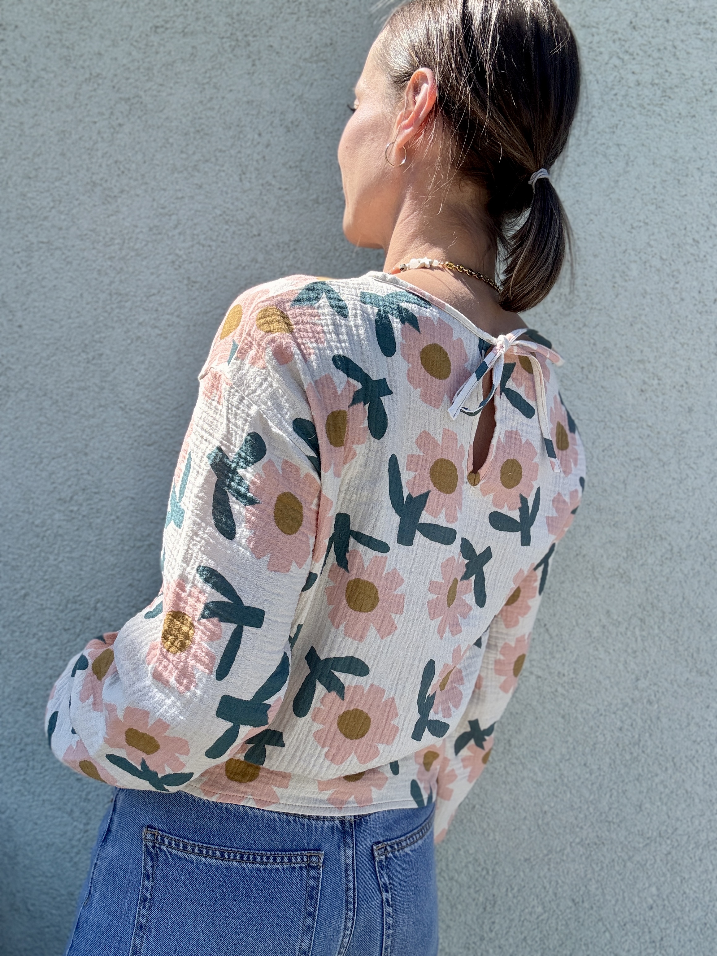 Koszula ma luźny, niewymuszony krój z obniżoną linią ramion oraz rękaw zakończony delikatną gumką. Subtelne wiązanie na plecach pozwala dopasować formę do sylwetki, a miękko układający się dekolt z tyłu dodaje całości lekkości i naturalnego charakteru.