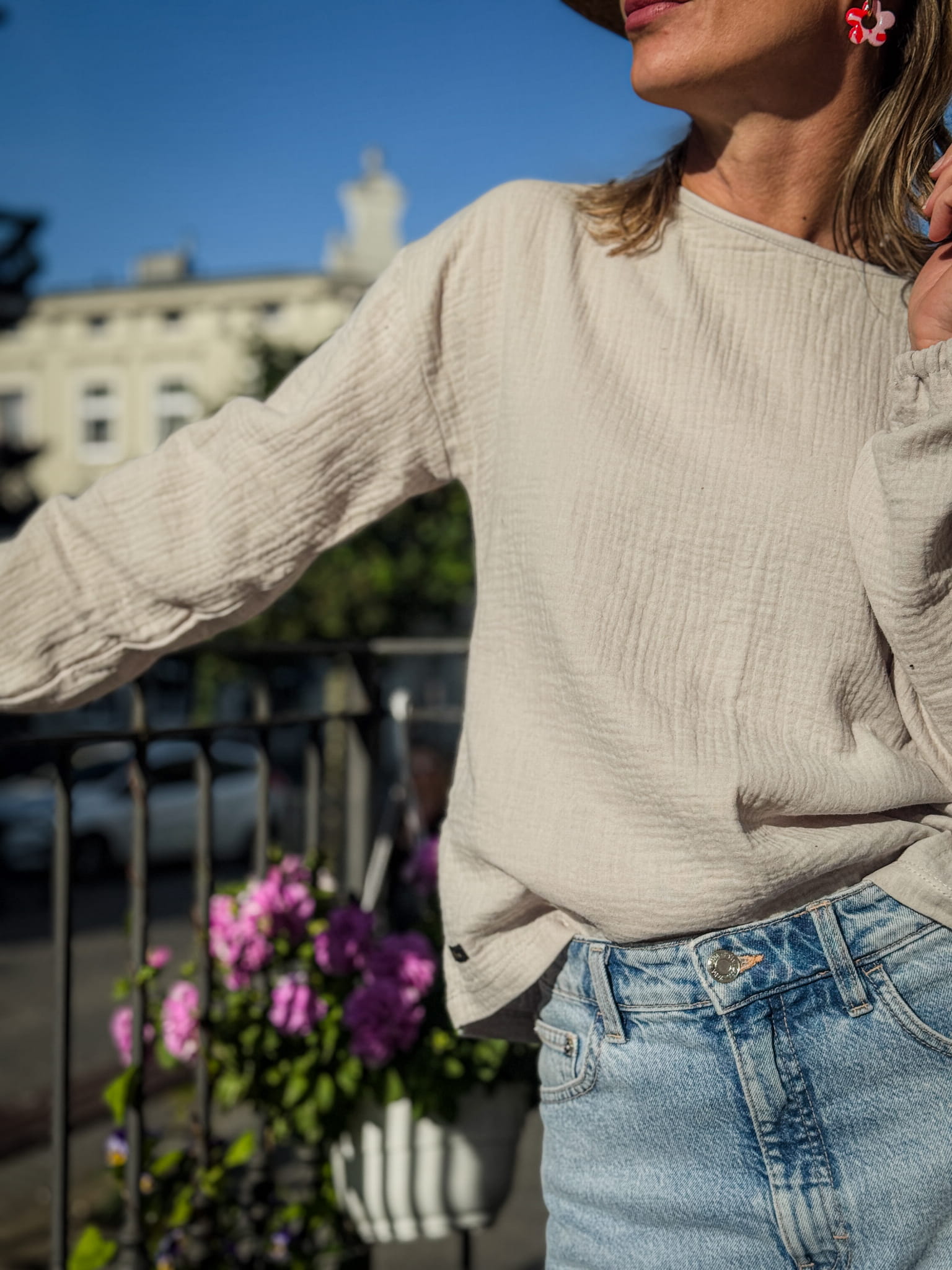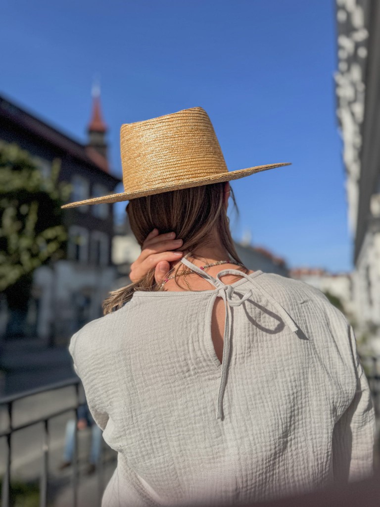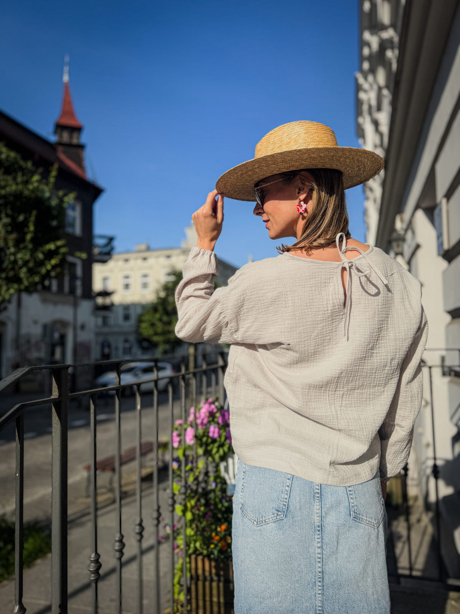 Luźny krój z obniżoną linią ramion ładnie układa się na sylwetce, a wiązanie na plecach to subtelny detal, który dodaje uroku i lekkości. Możesz zawiązać je na kokardkę albo puścić swobodnie – wszystko zależy od Ciebie.