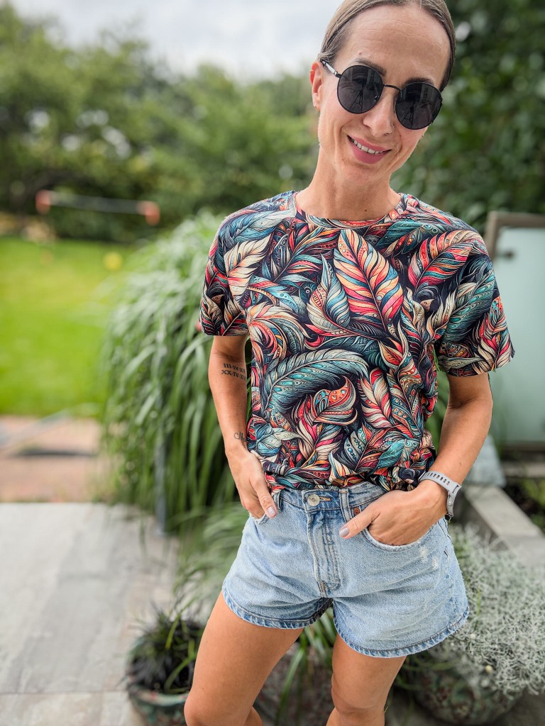 Koszulka w piórka to manifest kobiecej lekkości i niezależności. Delikatny print w stylu boho – eteryczne pióra unoszące się na tle tkaniny – wprowadza spokój, naturę i swobodę w Twoją codzienność. To nie tylko ubranie, to klimat – letni, wolny, autentyczny.
