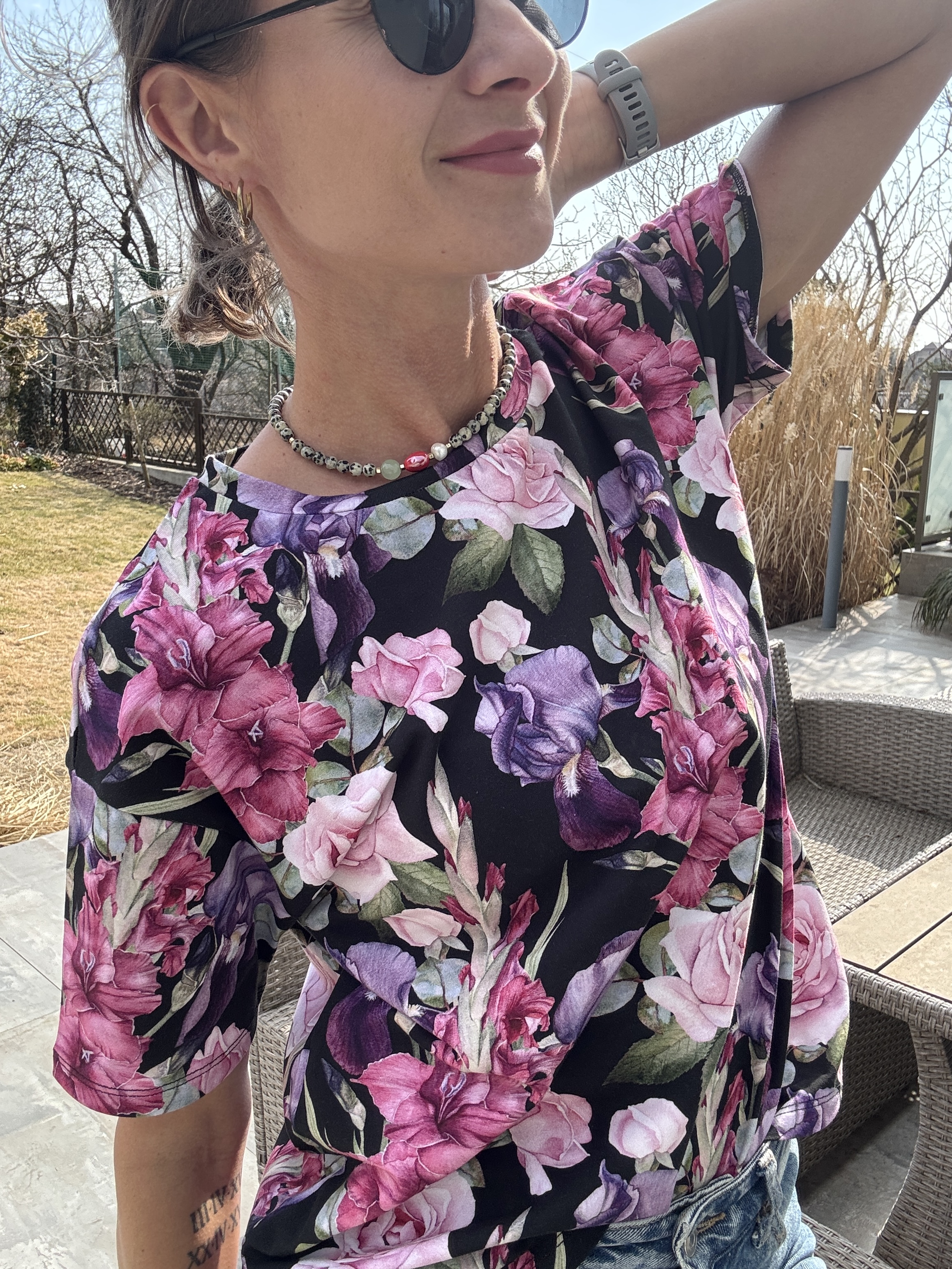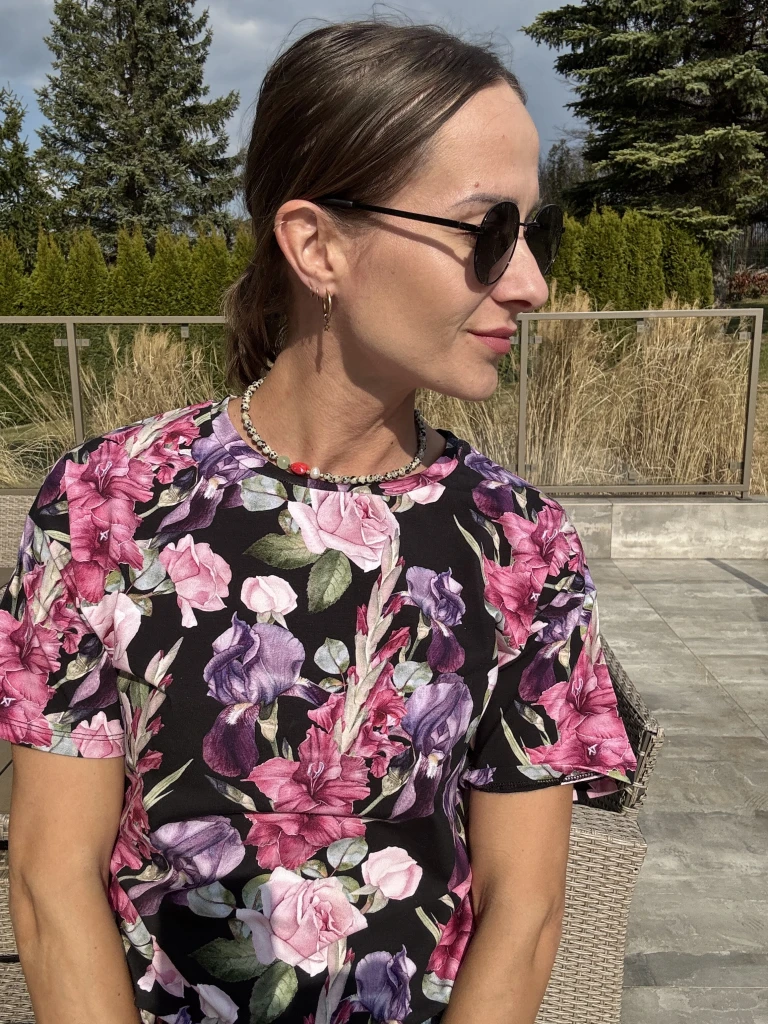 Są wzory, które nie potrzebują wielu dodatków. Wystarczy kontrast i dobrze dobrana forma. Ta koszulka na czarnym tle, pokryta motywem różowych irysów, ma w sobie wyrazistość, która nie przytłacza — raczej podkreśla.