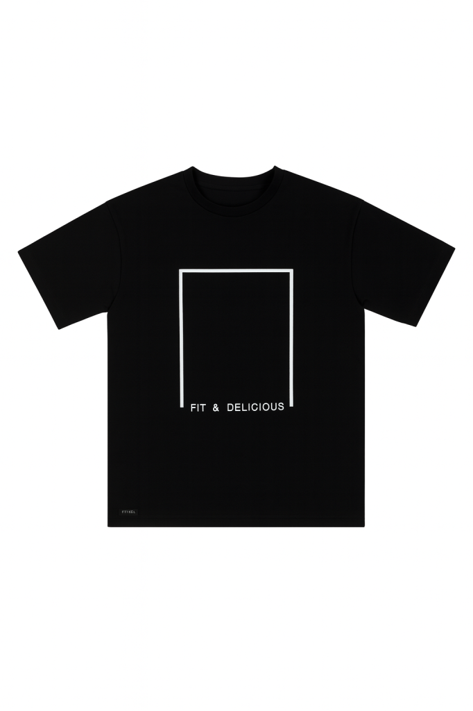 Czarna koszulka męska z nadrukiem fit&delicious to prosty komunikat z charakterem. Minimalistyczna forma, wyraźny napis i nowoczesny kubełkowy krój oversize sprawiają, że ten t-shirt działa bez wysiłku — zakładasz go i stylizacja jest gotowa.