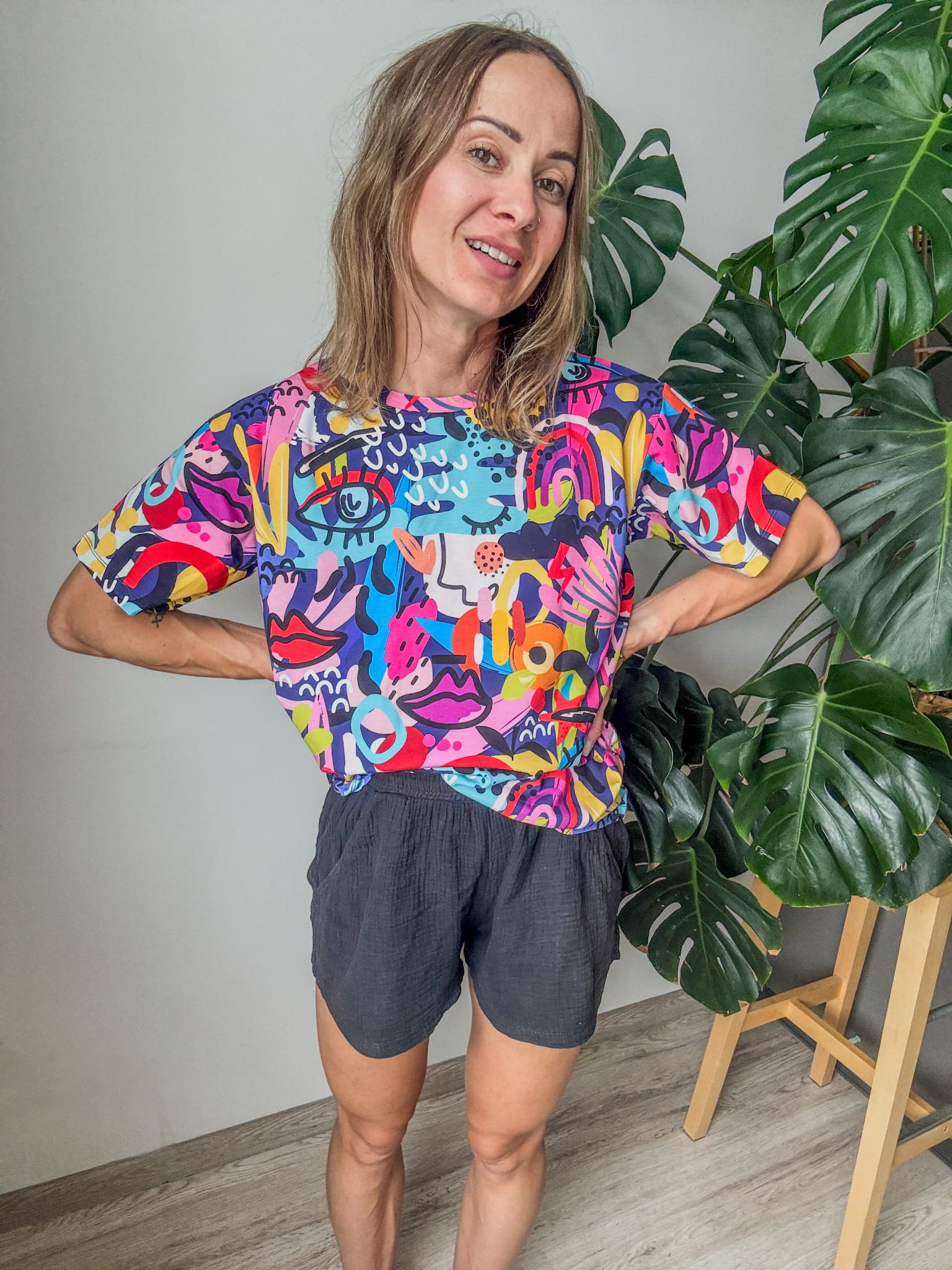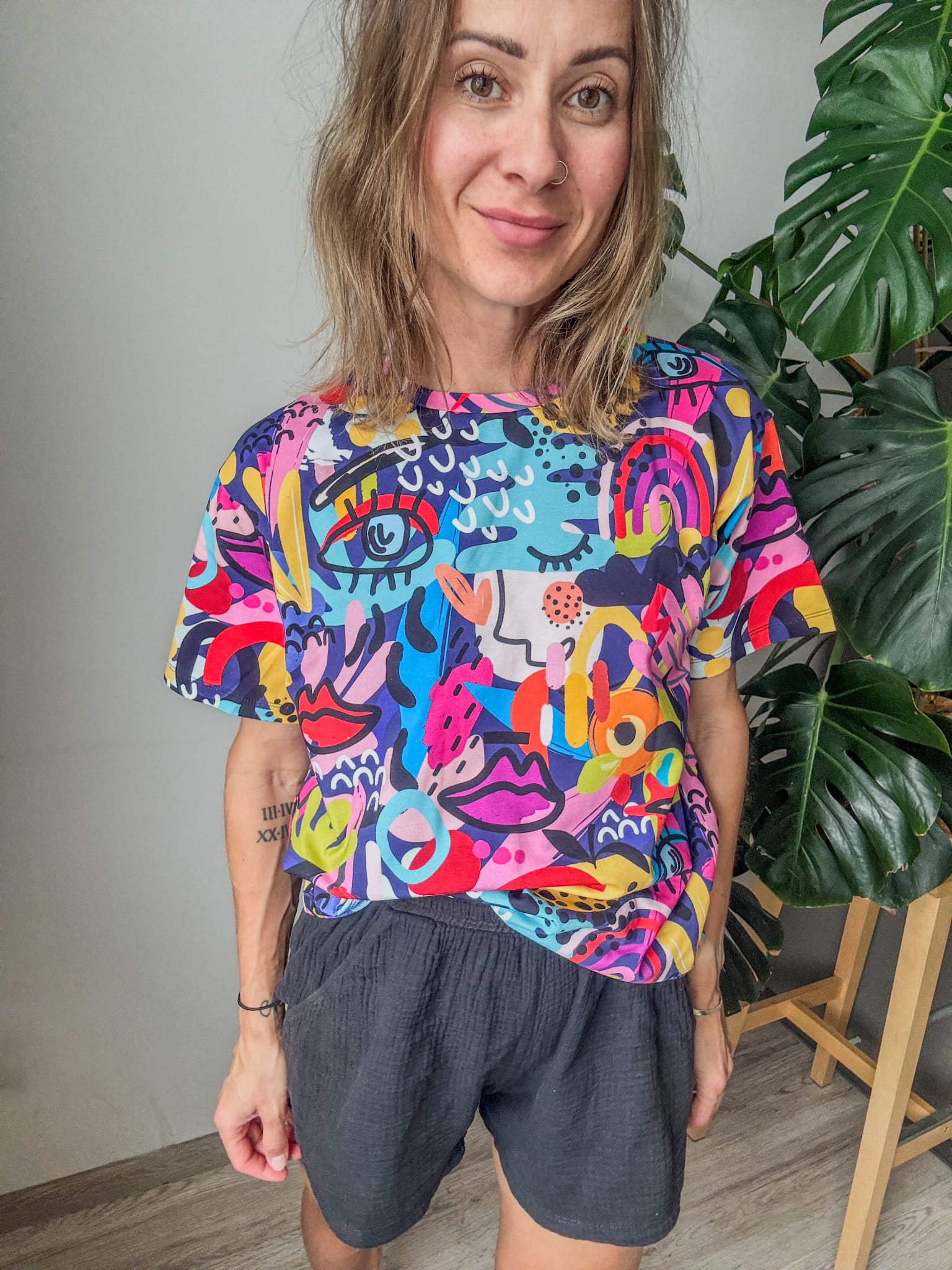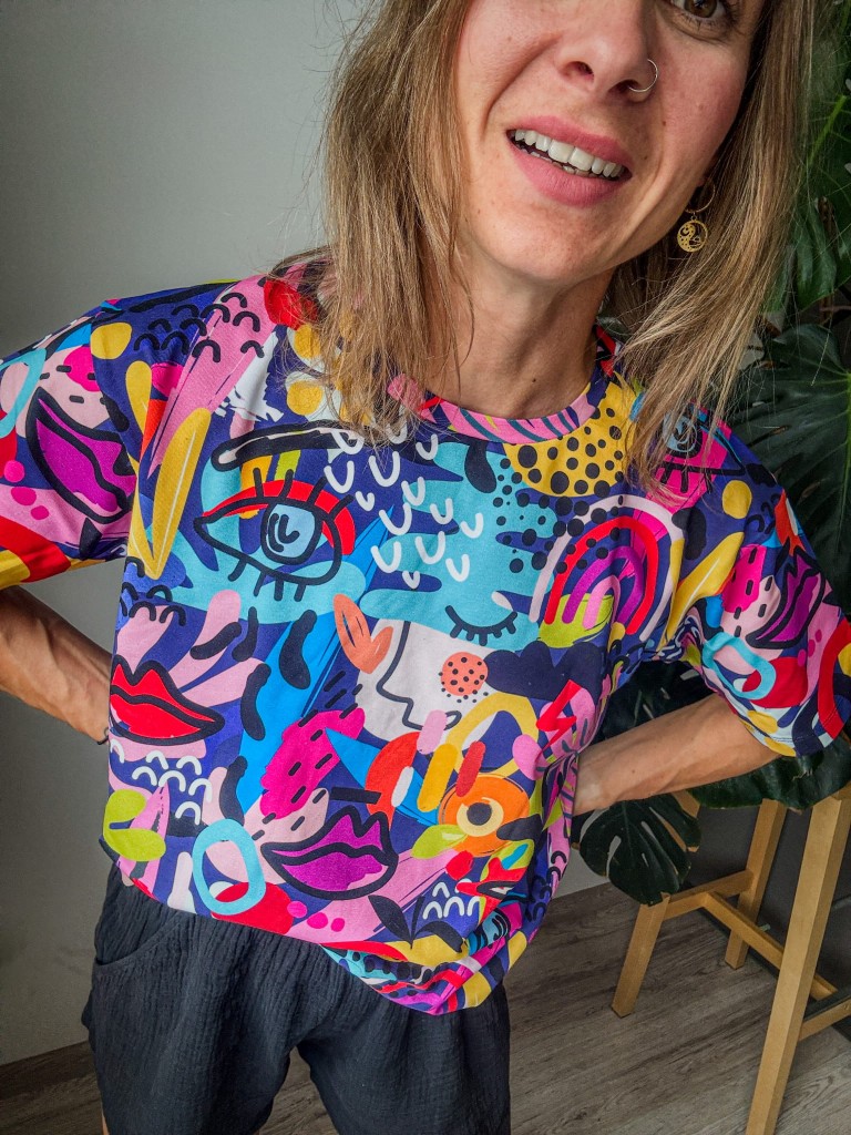 Nadruk inspirowany abstrakcją to gra kolorów: róż, błękit i słoneczna żółć wirują na materiale niczym pociągnięcia pędzla na świeżym płótnie. Efekt? Koszulka, która w jednej chwili ożywia całą stylizację.