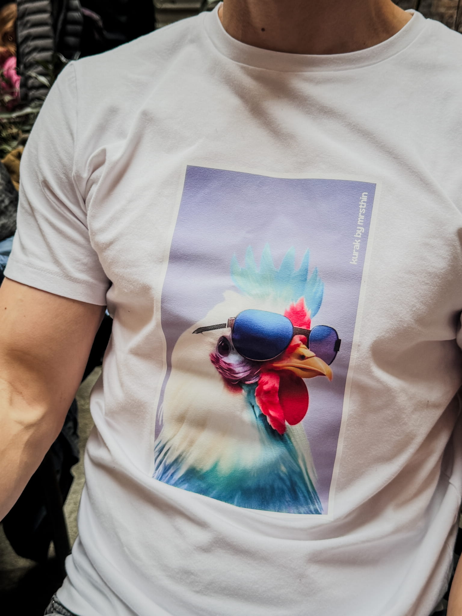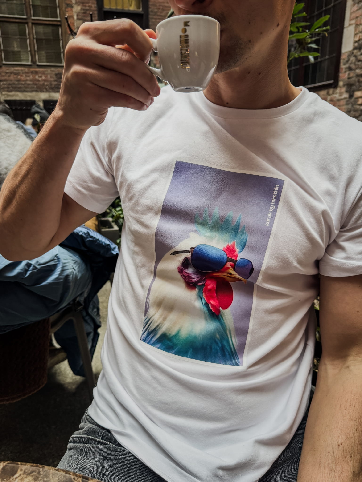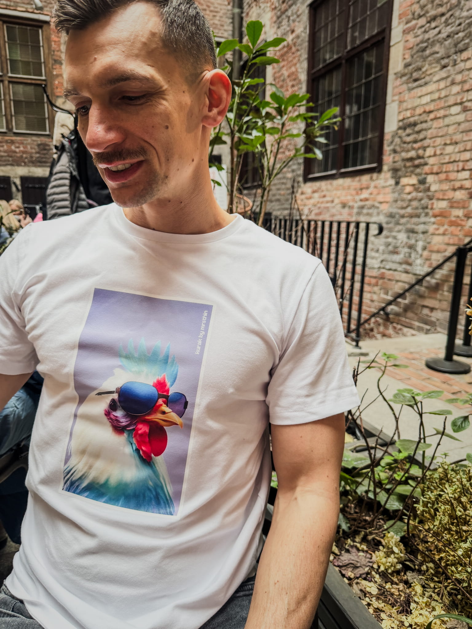 Autorski nadruk kury dodaje temu t-shirtowi charakteru — lekko humorystyczny, trochę wakacyjny, a jednocześnie minimalistyczny. To ten rodzaj grafiki, który wyróżnia, ale nie krzyczy. Koszulka pasuje do jeansów, chinosów, szortów, bluzy lub lekkiej kurtki — jest po prostu uniwersalna.