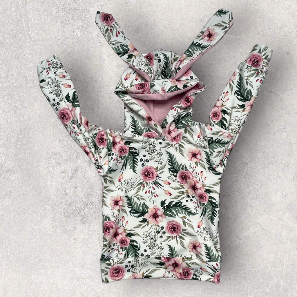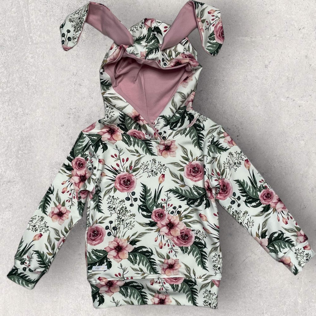 Bluza Królik z kapturem i uszami. Wzór In garden w połączeniu z kwarcowym różem. Rozchwytywany print od kilku sezonów. Model bez kieszeni kangurki po środku a jeżeli chcezsz aby była, wystarczy, że zaznaczysz taką opcję. Uszy królika to ciekawy element, który wspaniale pasuje do dziecięcych twarzy.