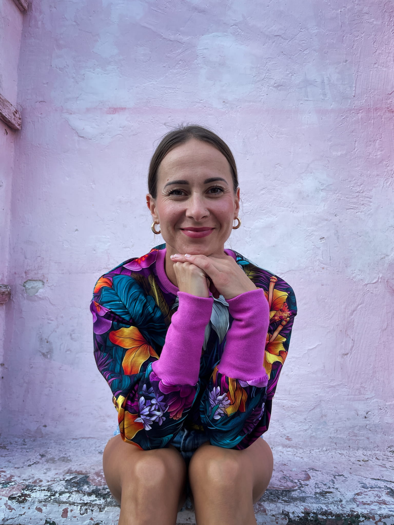 Damska bluza Flowers. W stylu casual. Jest dobrym pomysłem do pracy jak i na rower. Pasują do niej jasne jeansowe spodenki jak i ciemna ołówkowa spódnica.