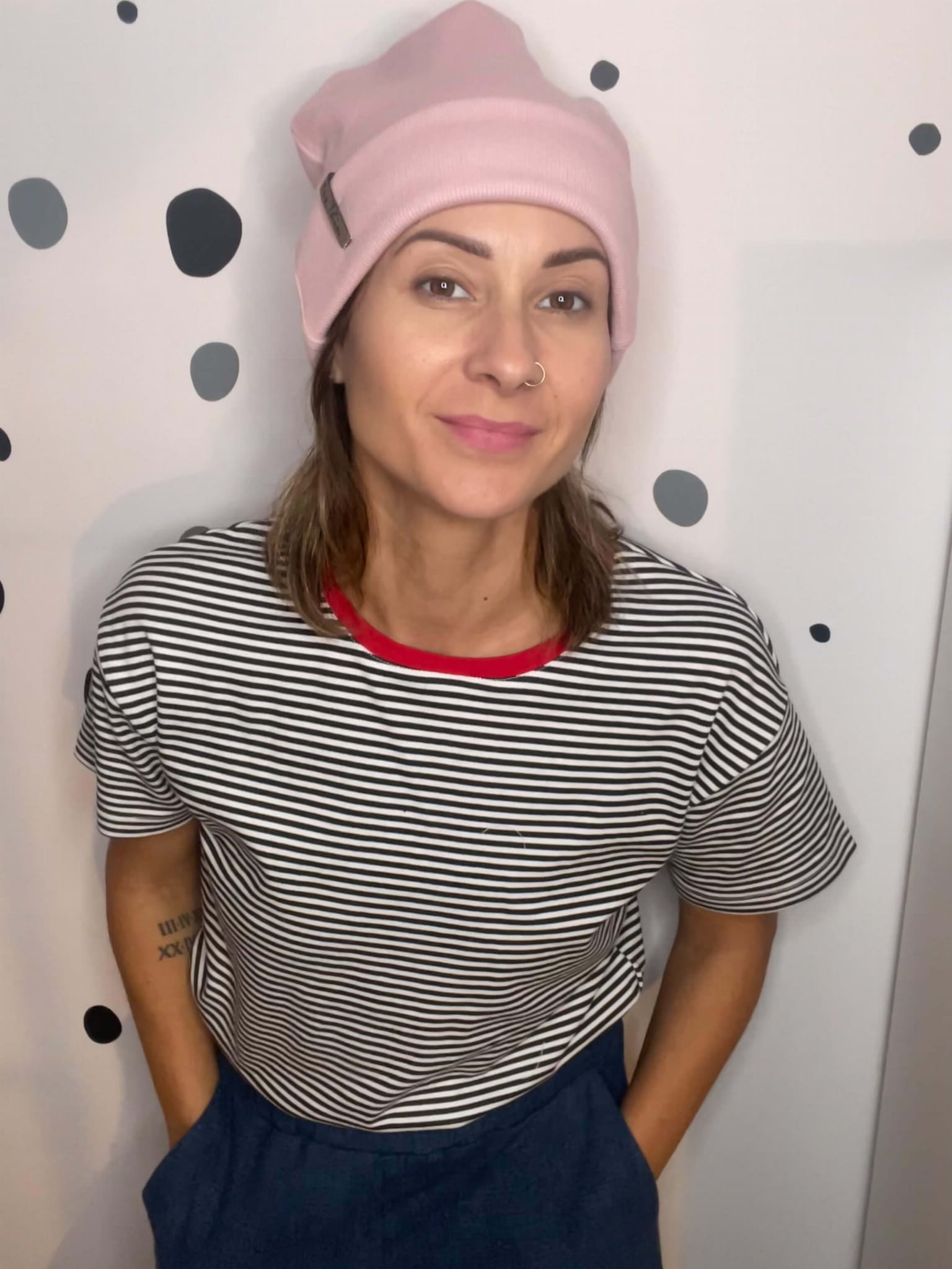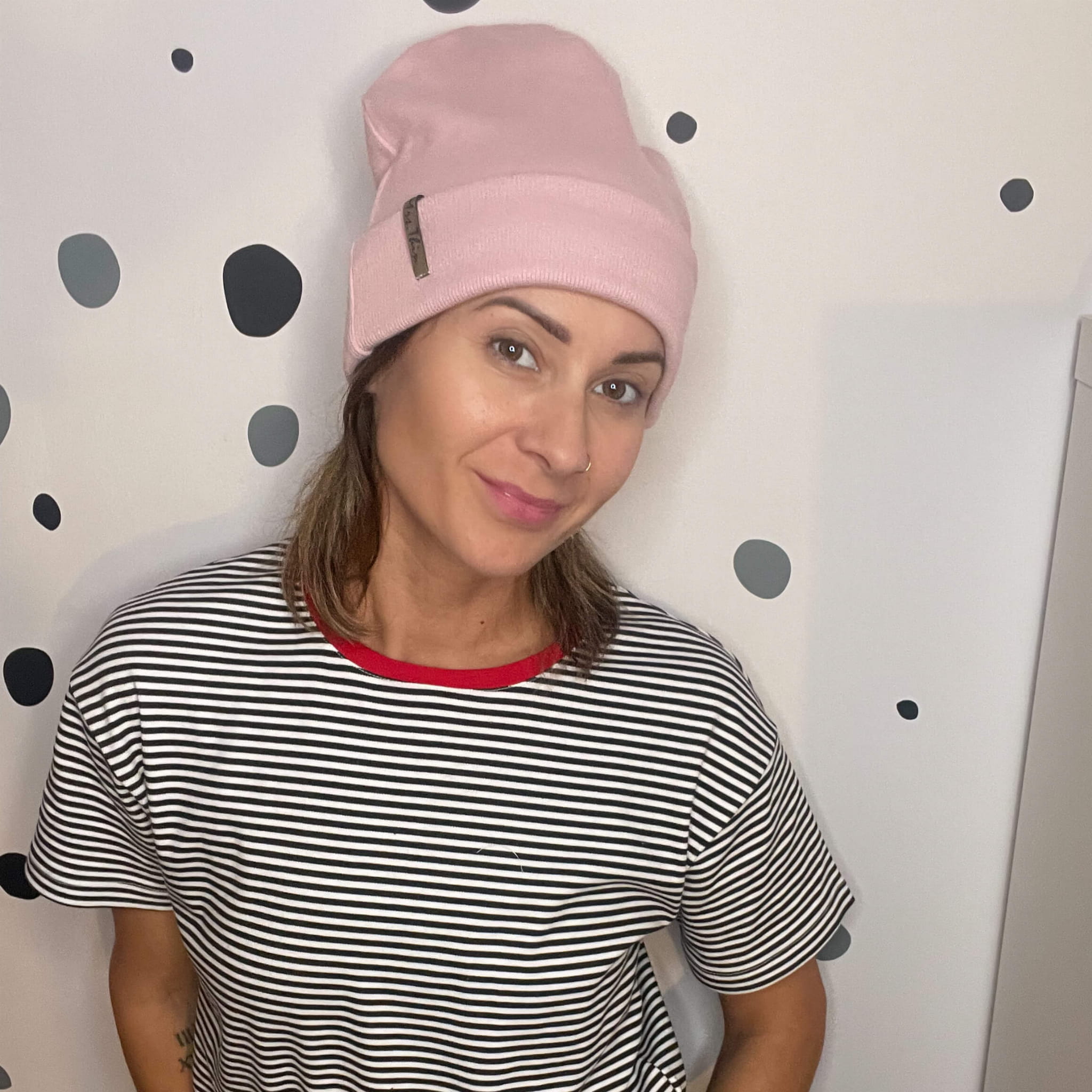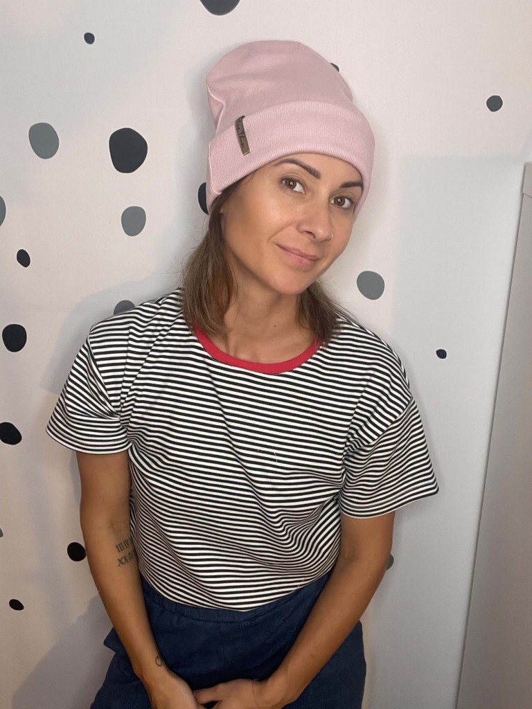 Czapka dobrze trzyma się głowy, ma modowy fason. Wywinięty szeroki mankiet sprawia, że jest ciepła i doskonale sprawdzi się na jesień i zimę. Kolor brudny róż (dusty pink).