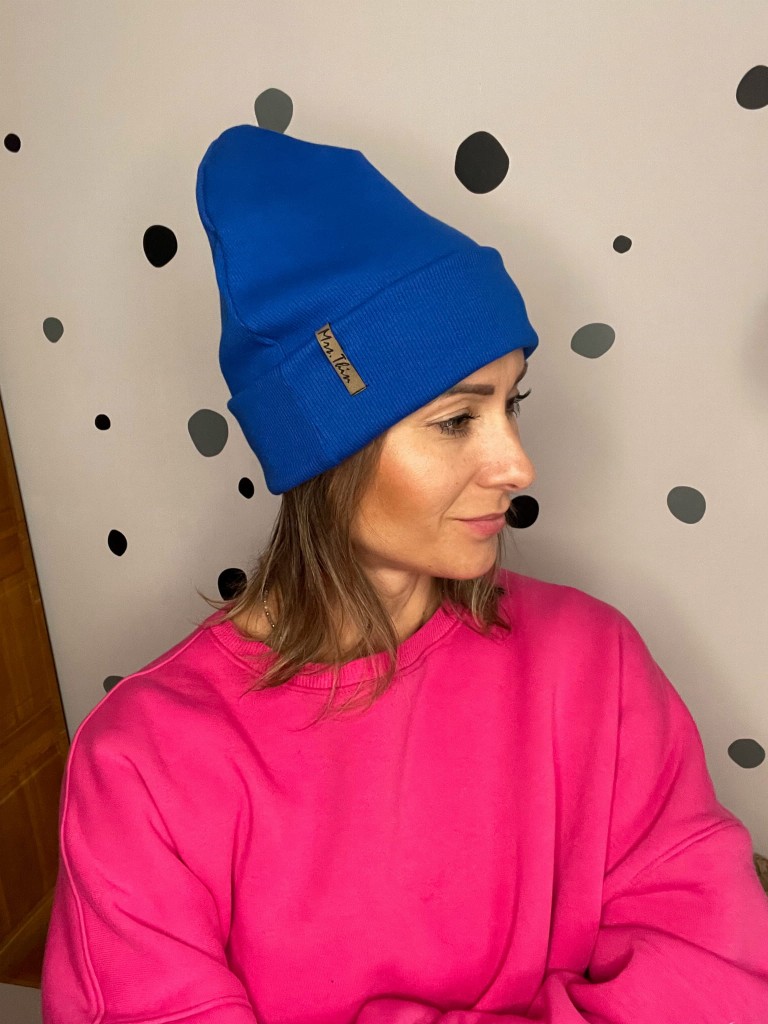Czapka dobrze trzyma się głowy, ma modowy fason. Wywinięty szeroki mankiet sprawia, że jest ciepła i doskonale sprawdzi się na jesień i zimę. Kolor chabrowy.