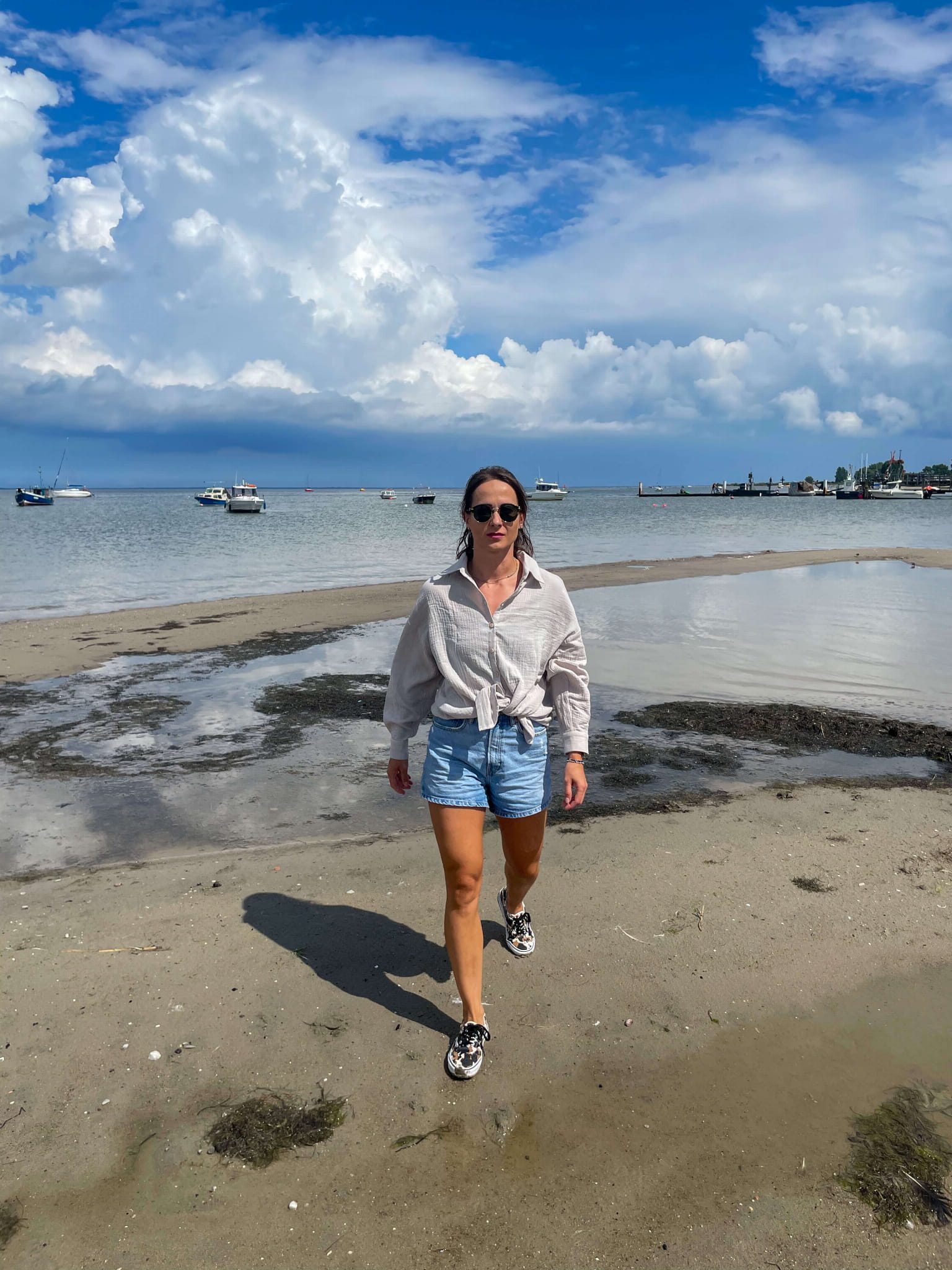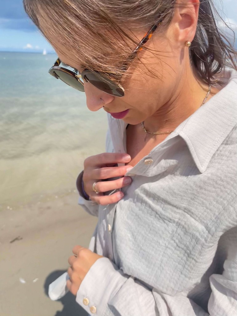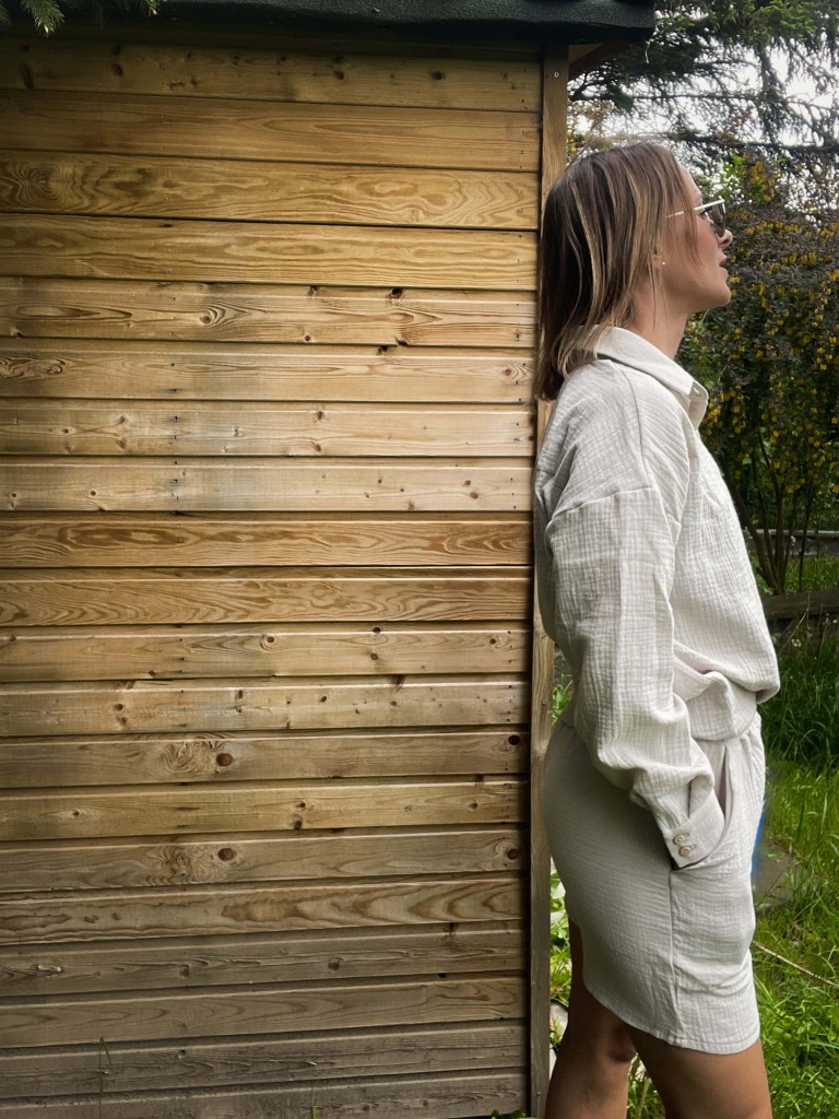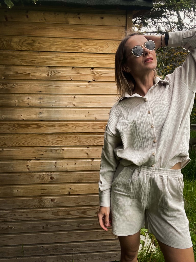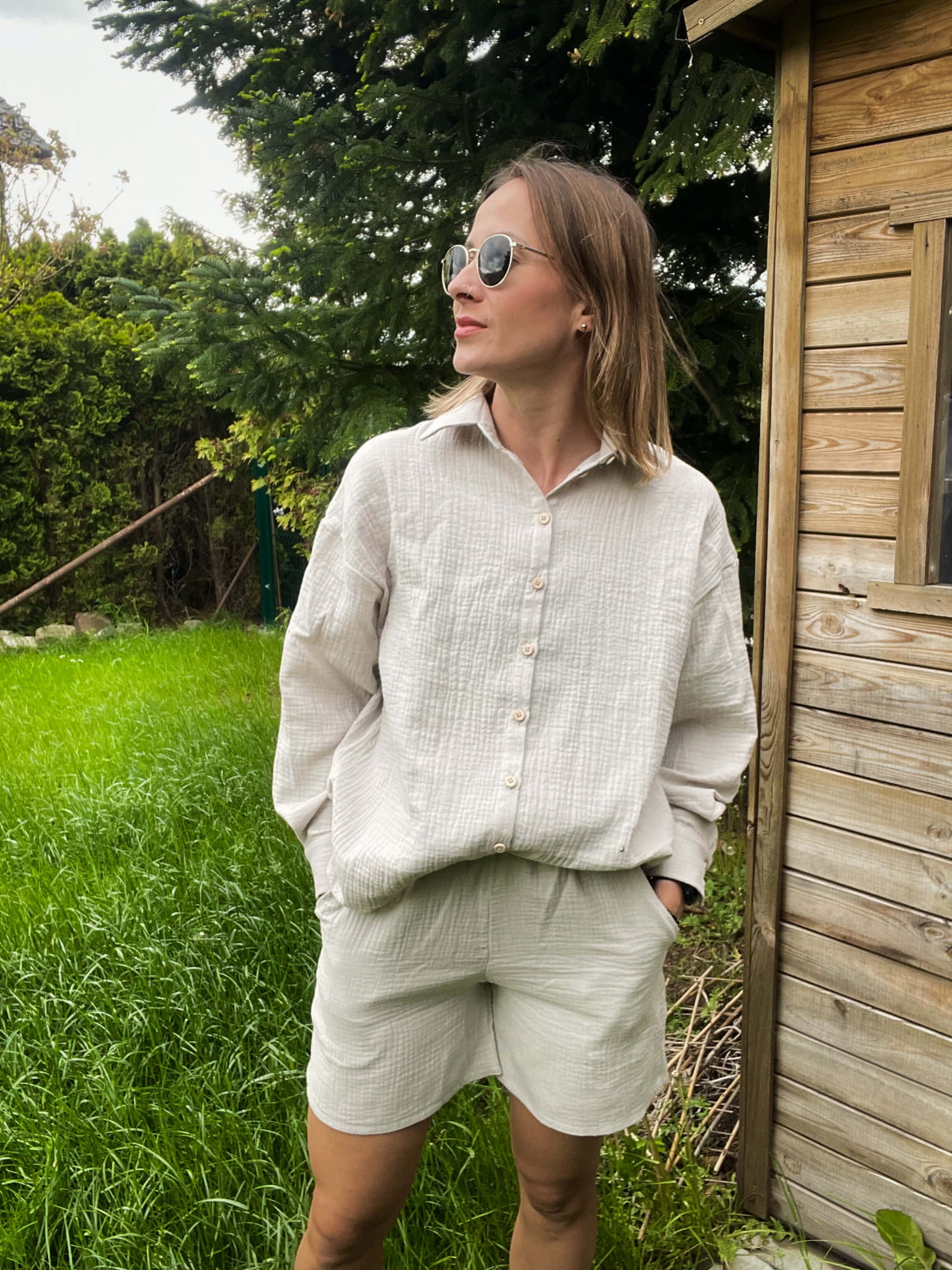 Zdobieniem koszuli na przodzie są drobne drewniane guziki. Stanowią one delikatne akcenty, dodające subtelnej elegancji i podkreślające kobiecy wdzięk. Obszyty kołnierz, zakładka na plecach, mankiet przy nadgarstku - to właśnie te niewielkie detale sprawiają, że cała kreacja nabiera wyjątkowego uroku.