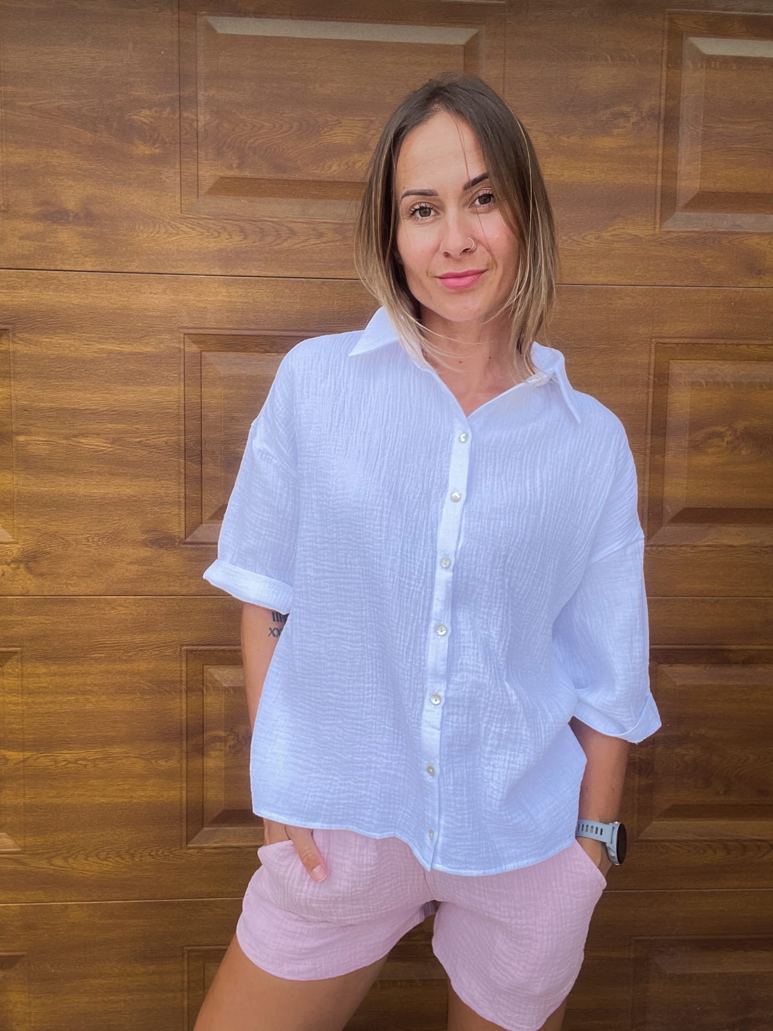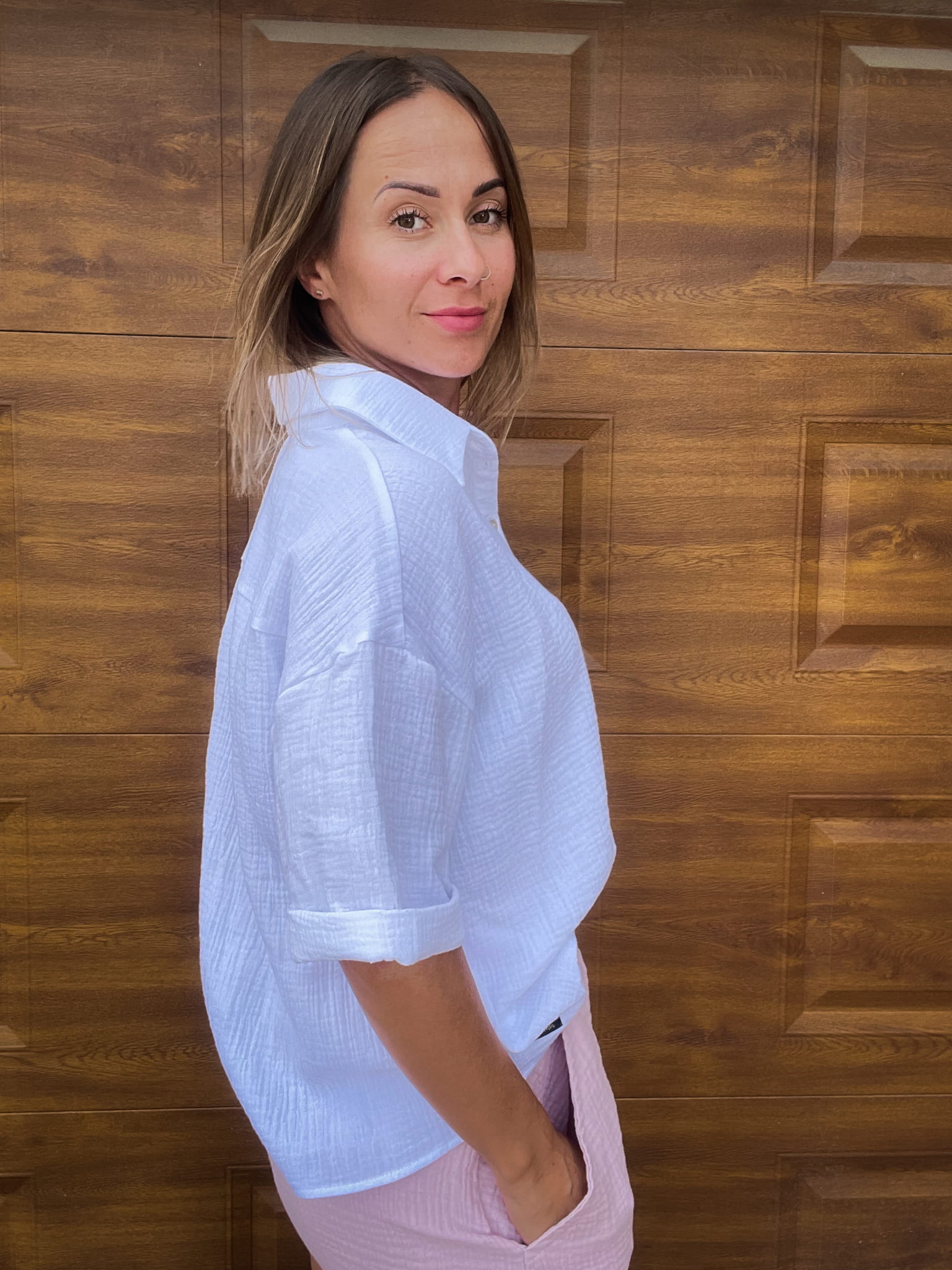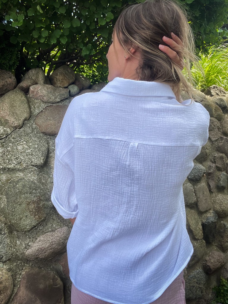 Koszula muślinowa o luźnym kroju z krótkim, ale dłuższym rękawem, który możesz dowolnie podwijać dostosowując ubiór do sytuacji i pogody.