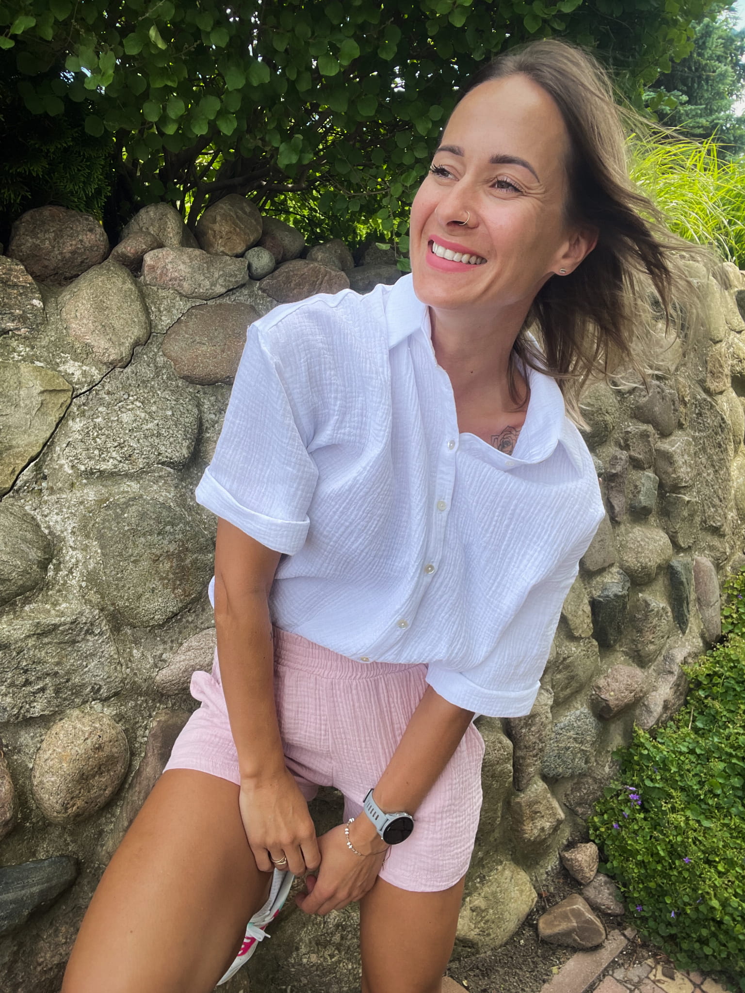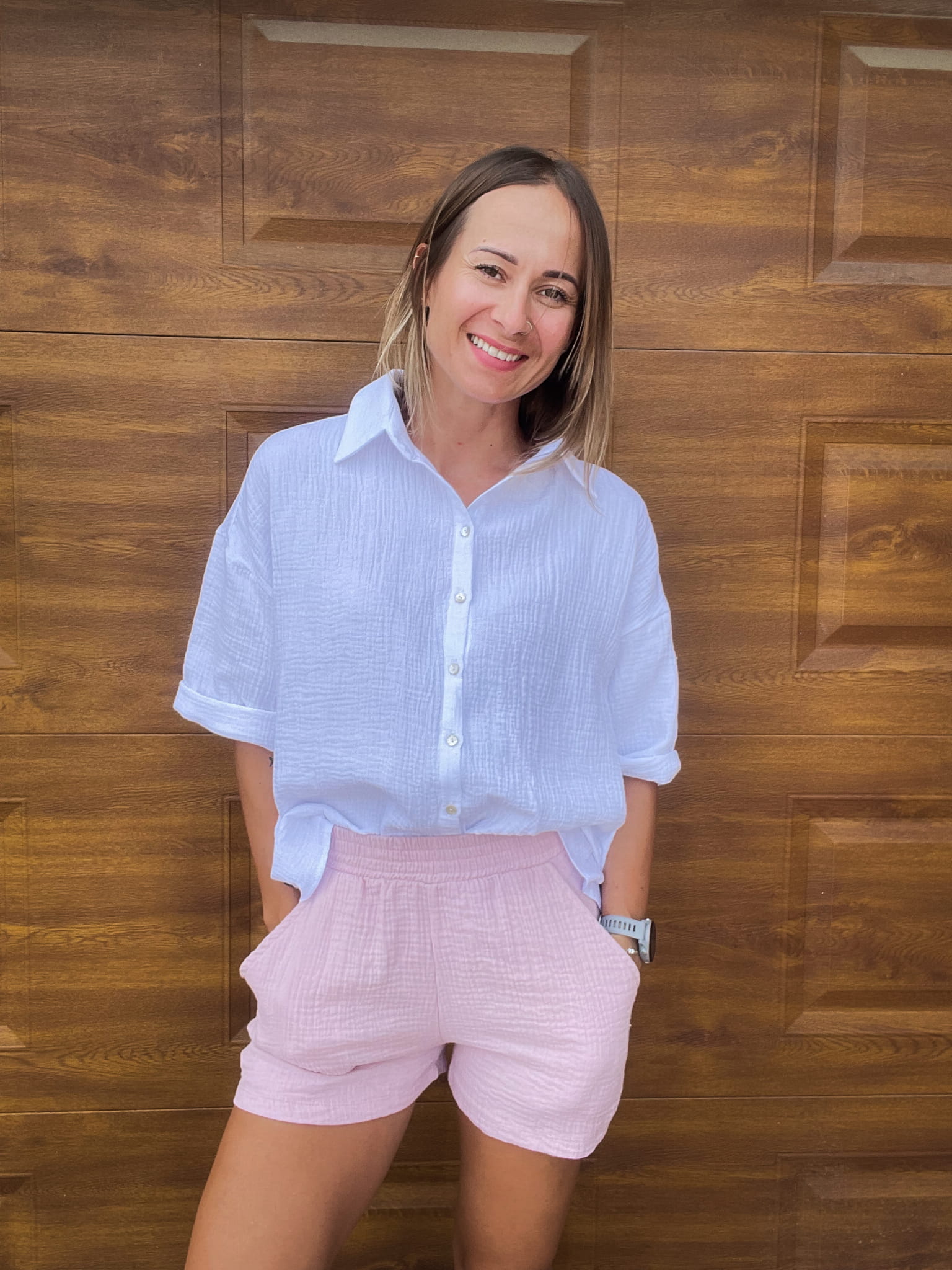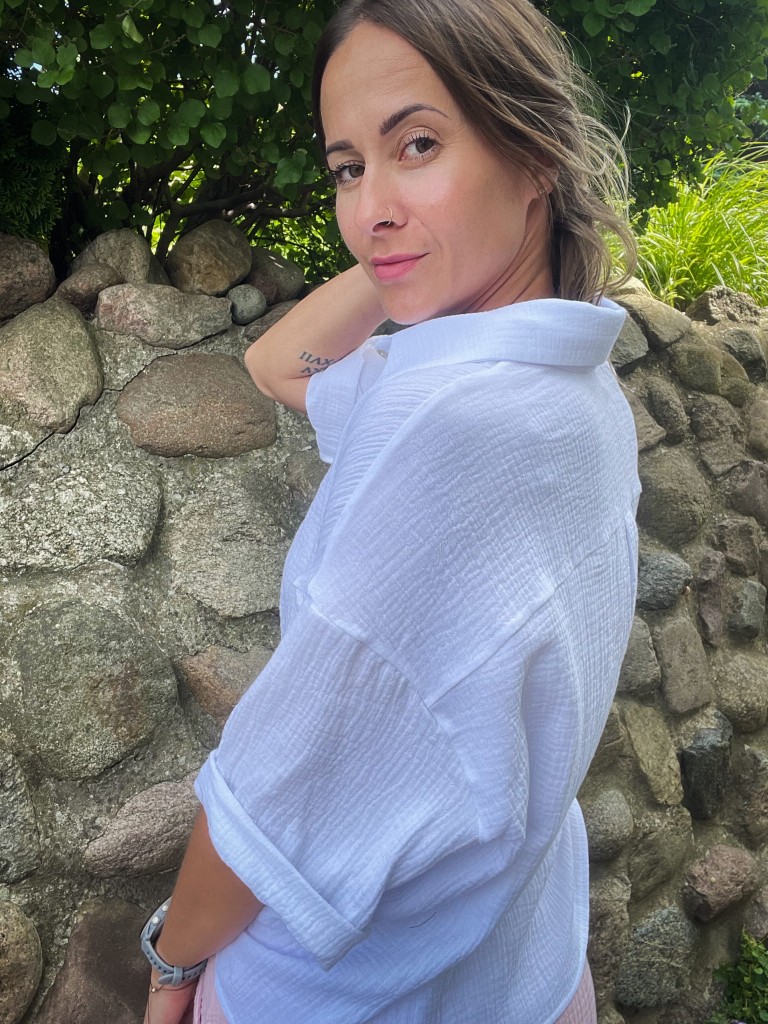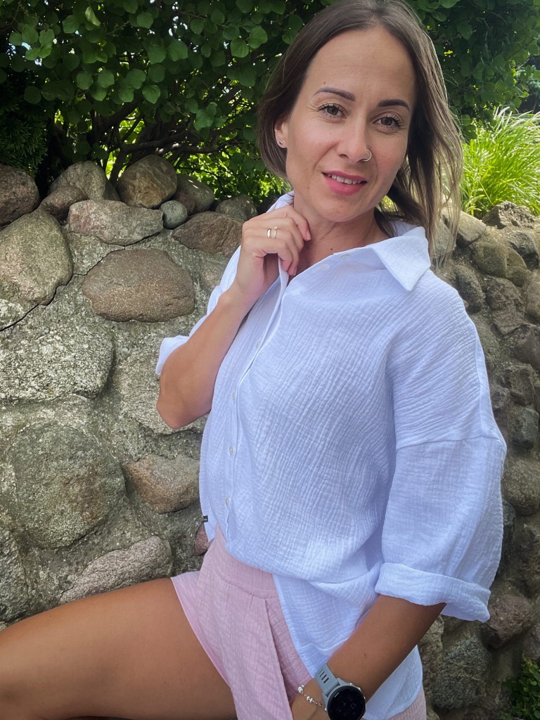 Koszula muślinowa o luźnym kroju z krótkim, ale dłuższym rękawem, który możesz dowolnie podwijać dostosowując ubiór do sytuacji i pogody.