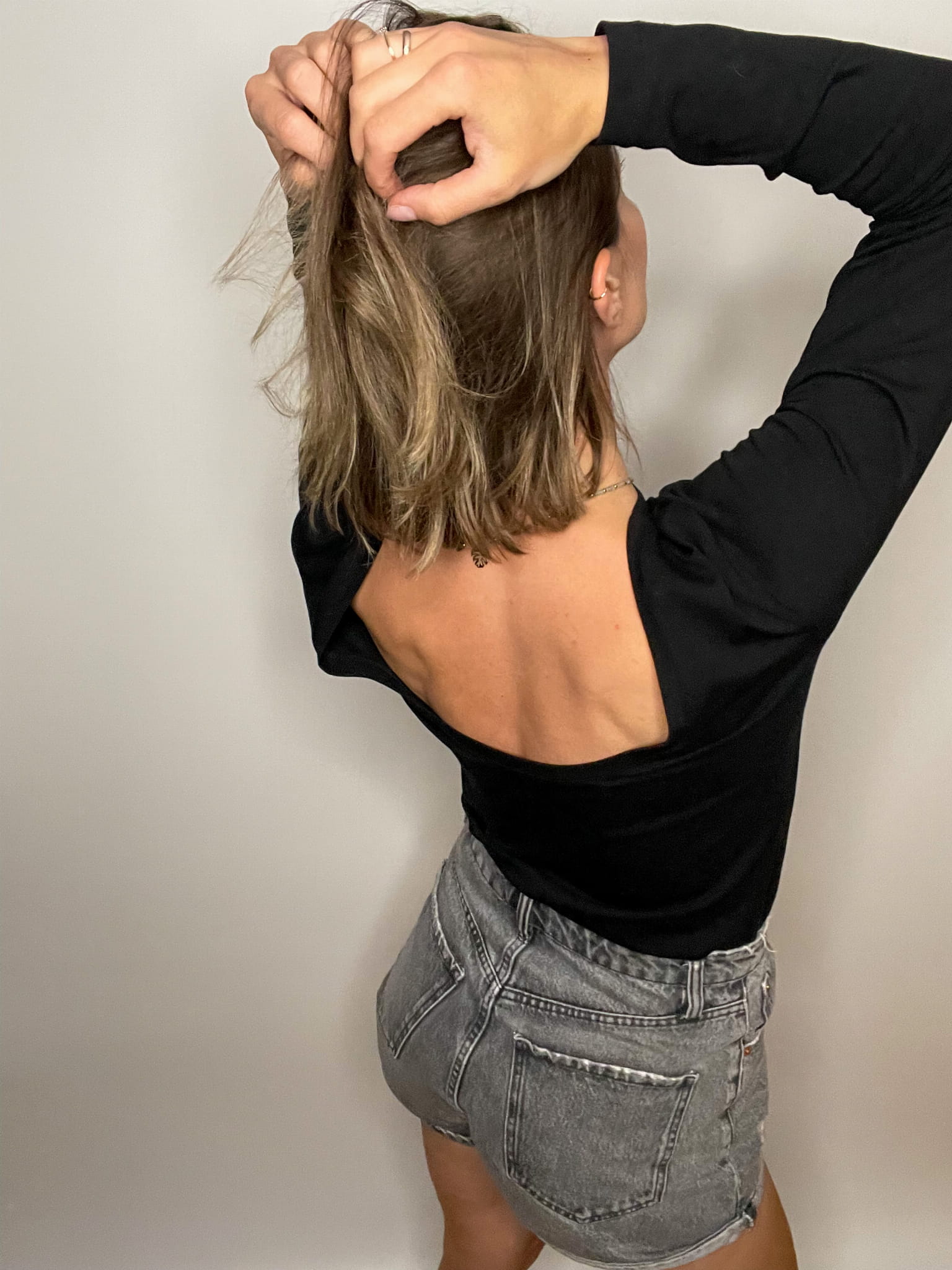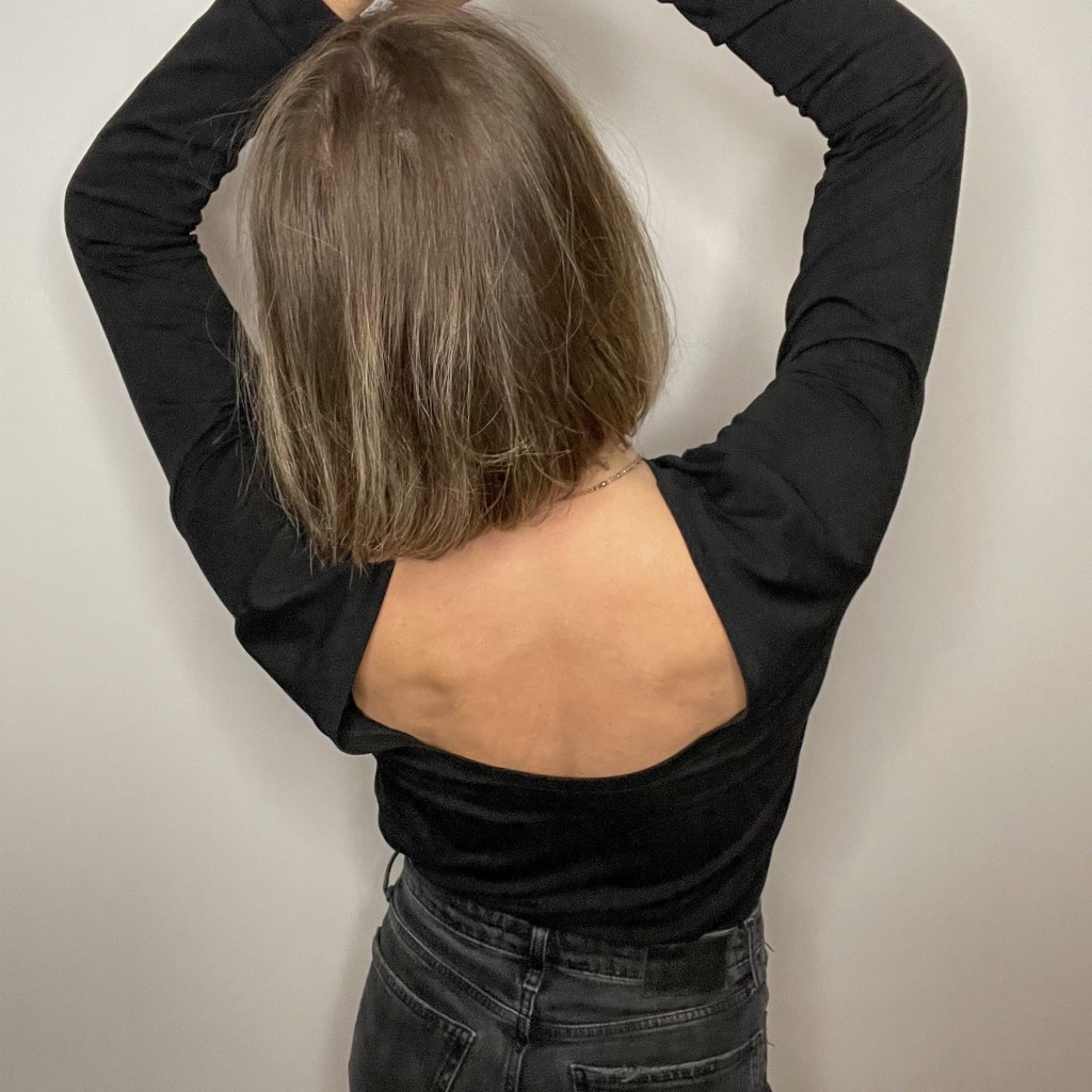 Ta bluzka to prawdziwa definicja zmysłowości. Wykonana z delikatnego czarnego jerseyu, podkreśla kobiecą elegancję i subtelność. Jej najbardziej kuszącym elementem jest dekolt, który odsłania subtelnie plecy, dodając odrobinę intrygi do tego wyjątkowego kroju.
