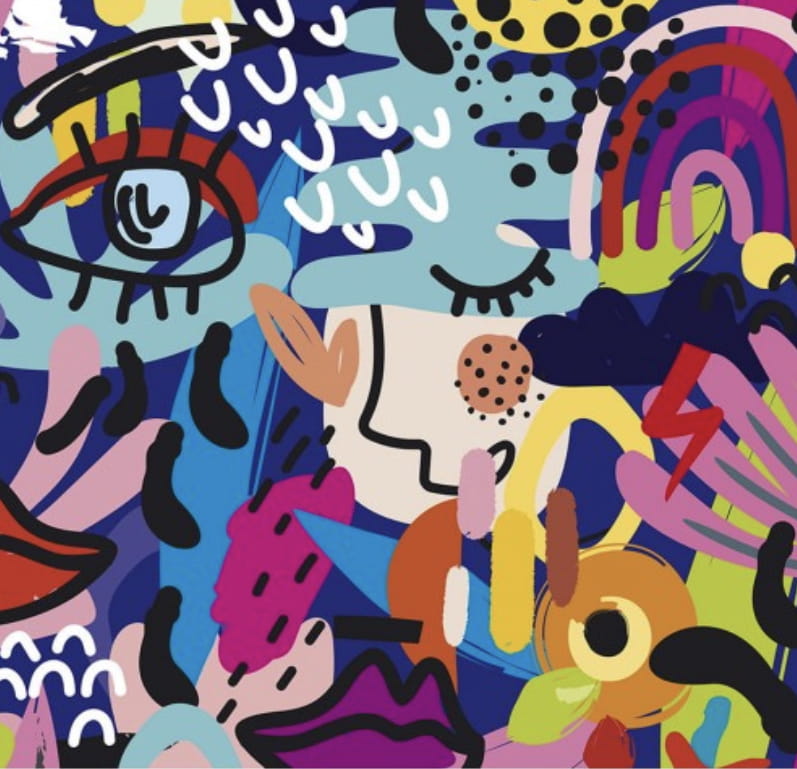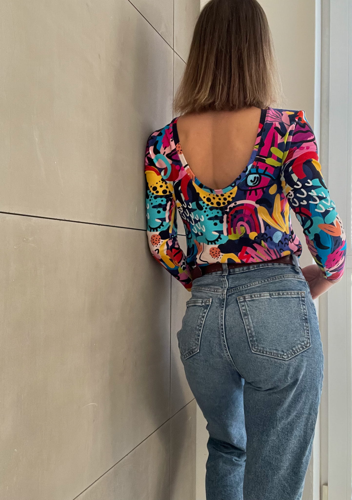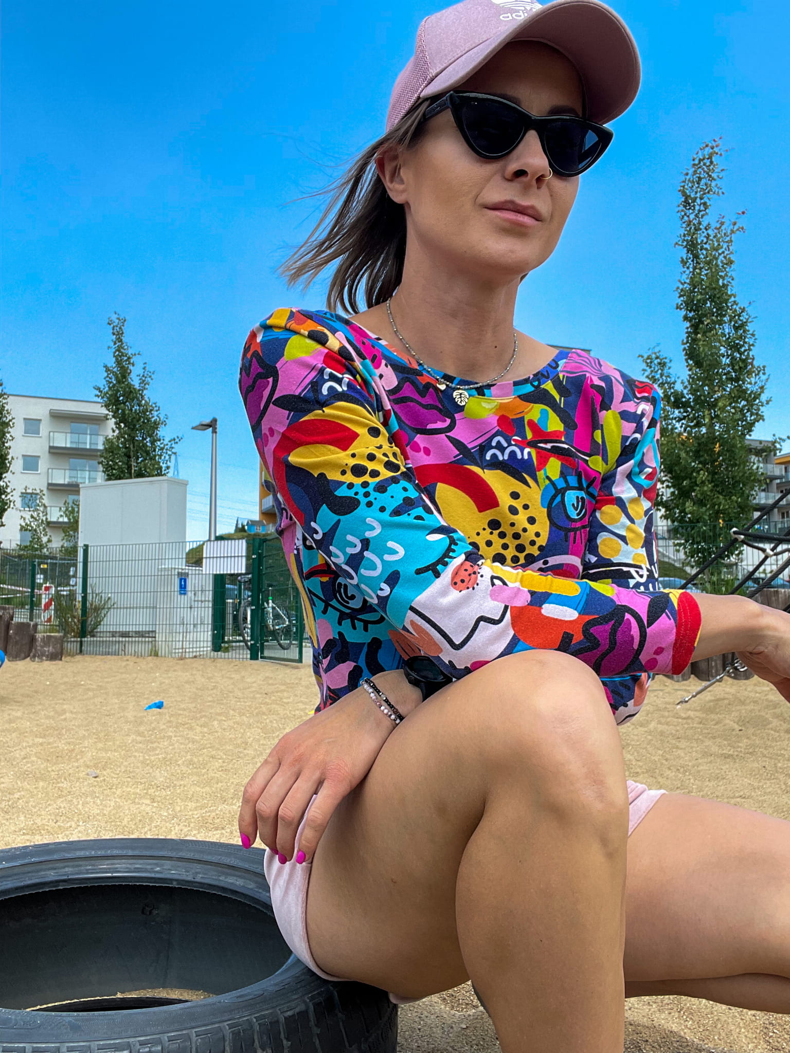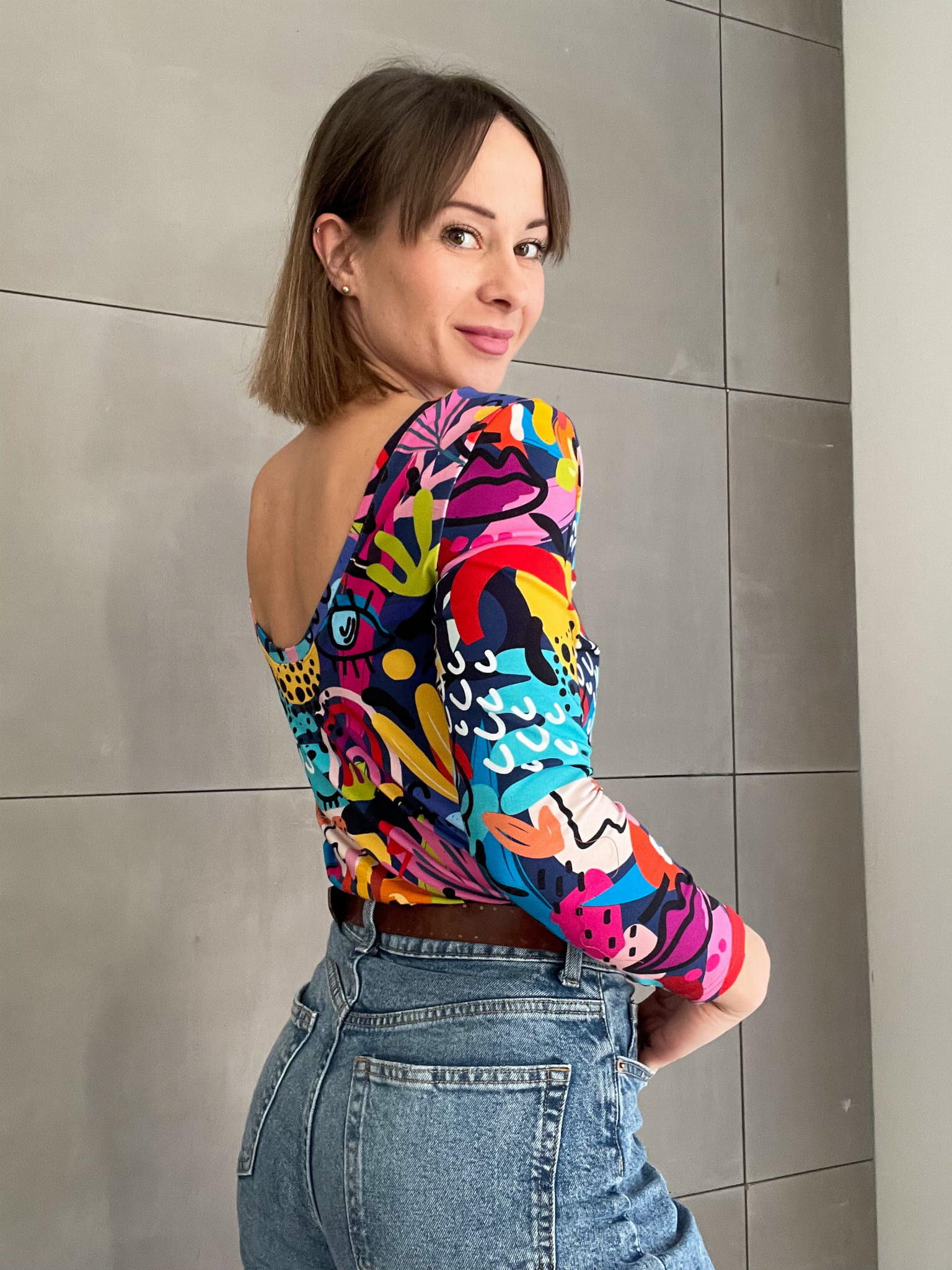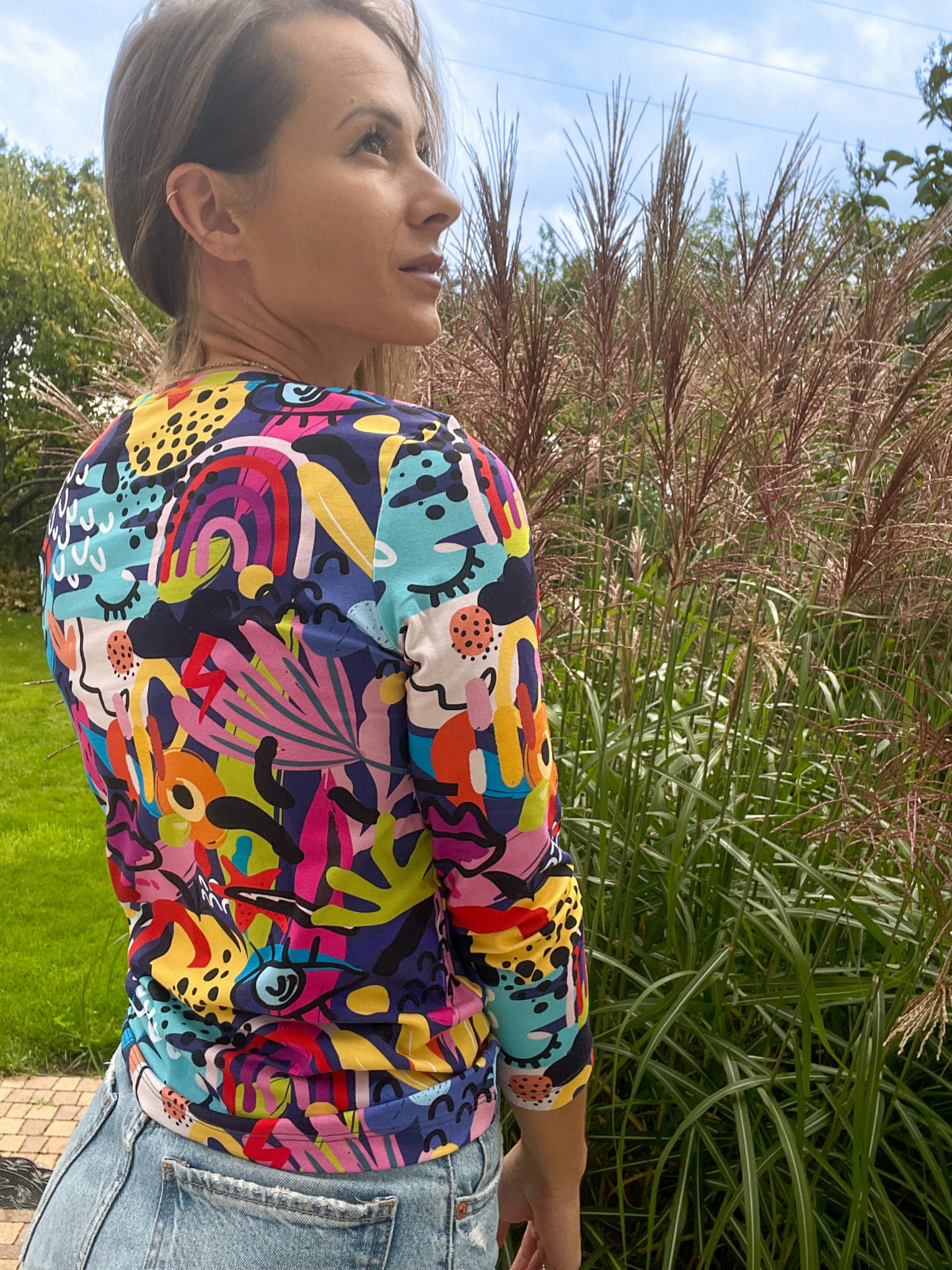Longsleeve Meggie w modernistyczny i nasycony kolorami wzór Abstrakcja. Poczuj się kobieco i lekko w tym sensualnym fasonie.