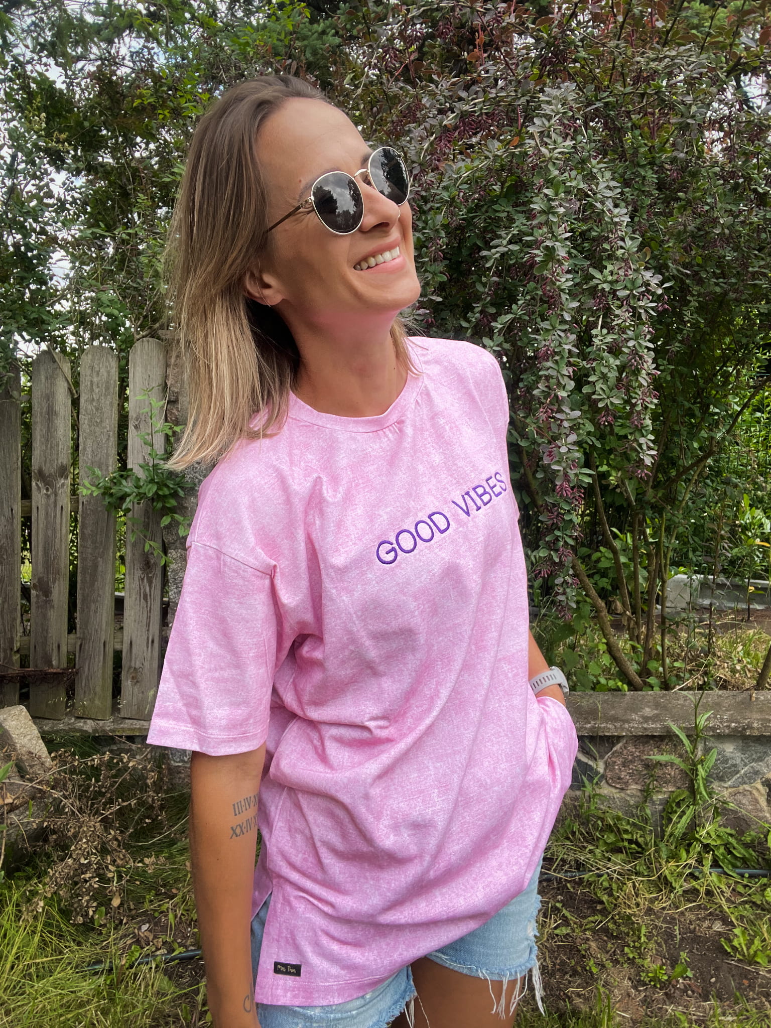 Ostatni element tego T-shirtu to haft GOOD VIBES w kolorze ciemnego fioletu.