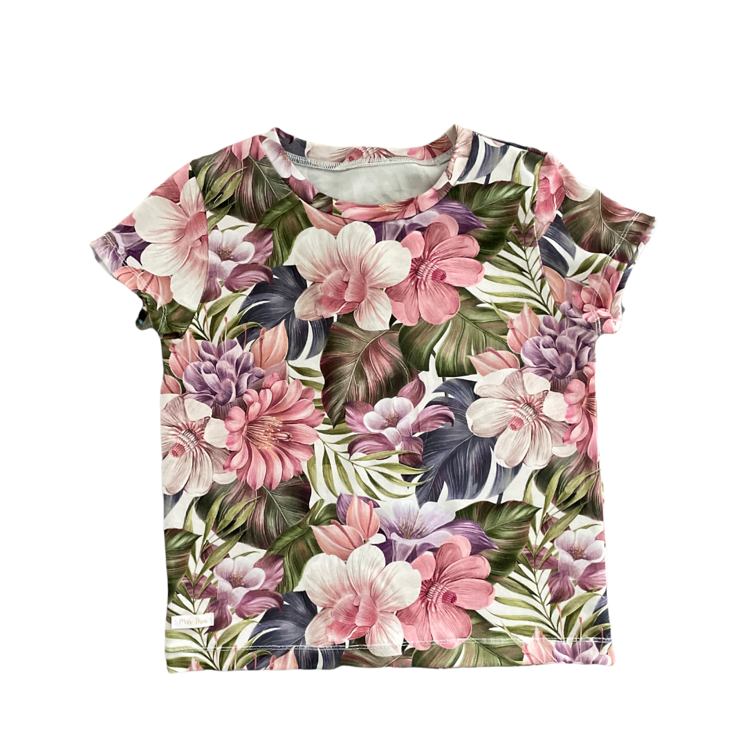 Koszulka dziecięca, letnia PIĘKNE KWIATY. Uszyta z wysokogatunkowego jerseyu, który jest miły w dotyku, nie spiera się i nie farbuje. Motyw kwiatów króluje od kilku sezonów a nasza propozycja to wspaniała kompozycja kolorystyczna różu, fioletu i zieleni.