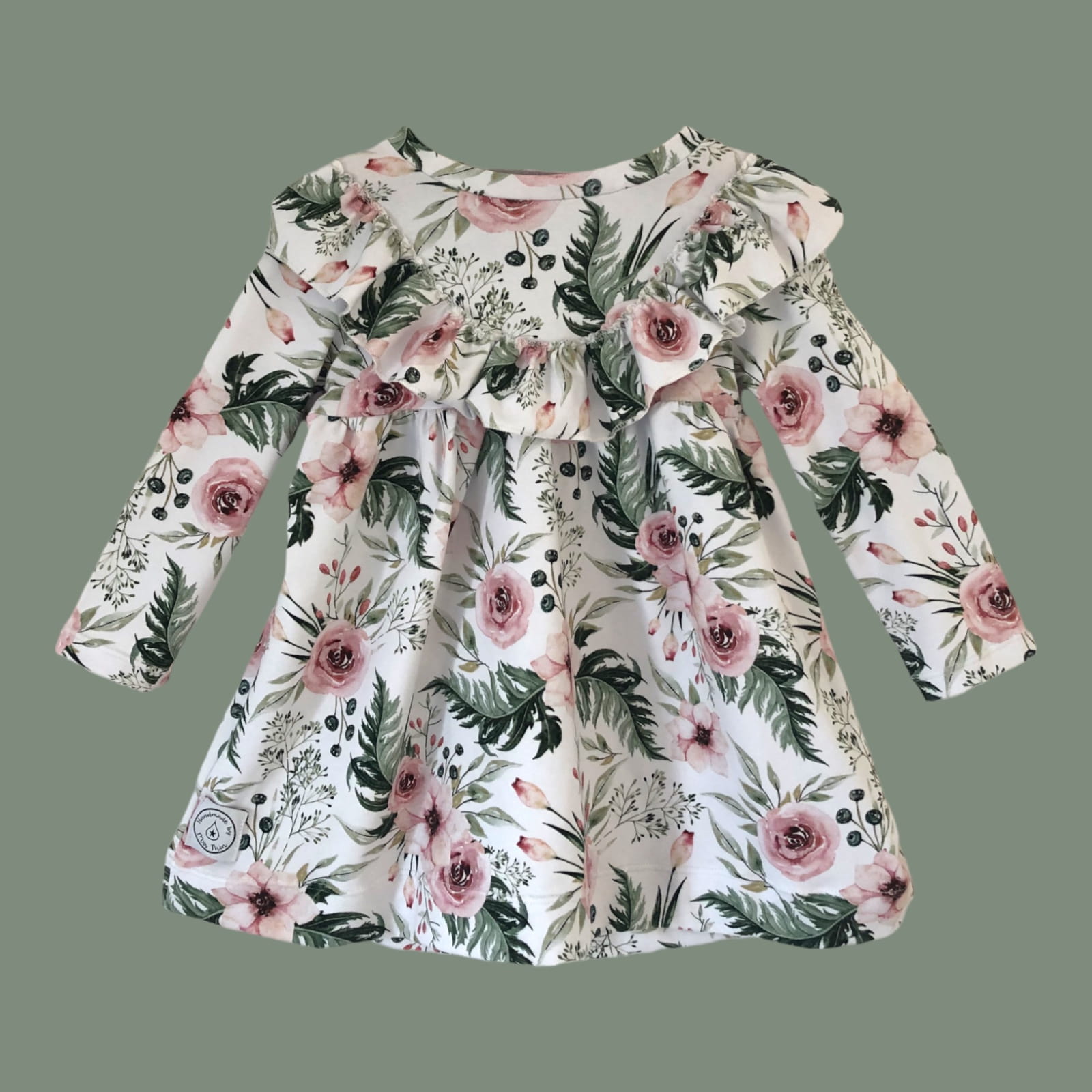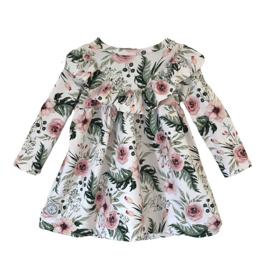 Sukienka Lana - wzór In Garden uszyta jest z miłej w dotyku i rozciągliwej dzianiny. Ulka ma długi, prosty rękaw, jest odcięta marszczeniem powyżej talii. Dookoła sukienki naszyta jest falbanka. Do sukienki możesz dokupić opaskę - w duchu idei zero waste opaski szyte są z resztek materiału. W zgodzie z ekologią produkujemy mniej śmieci w procesie wytwarzania ubrań.