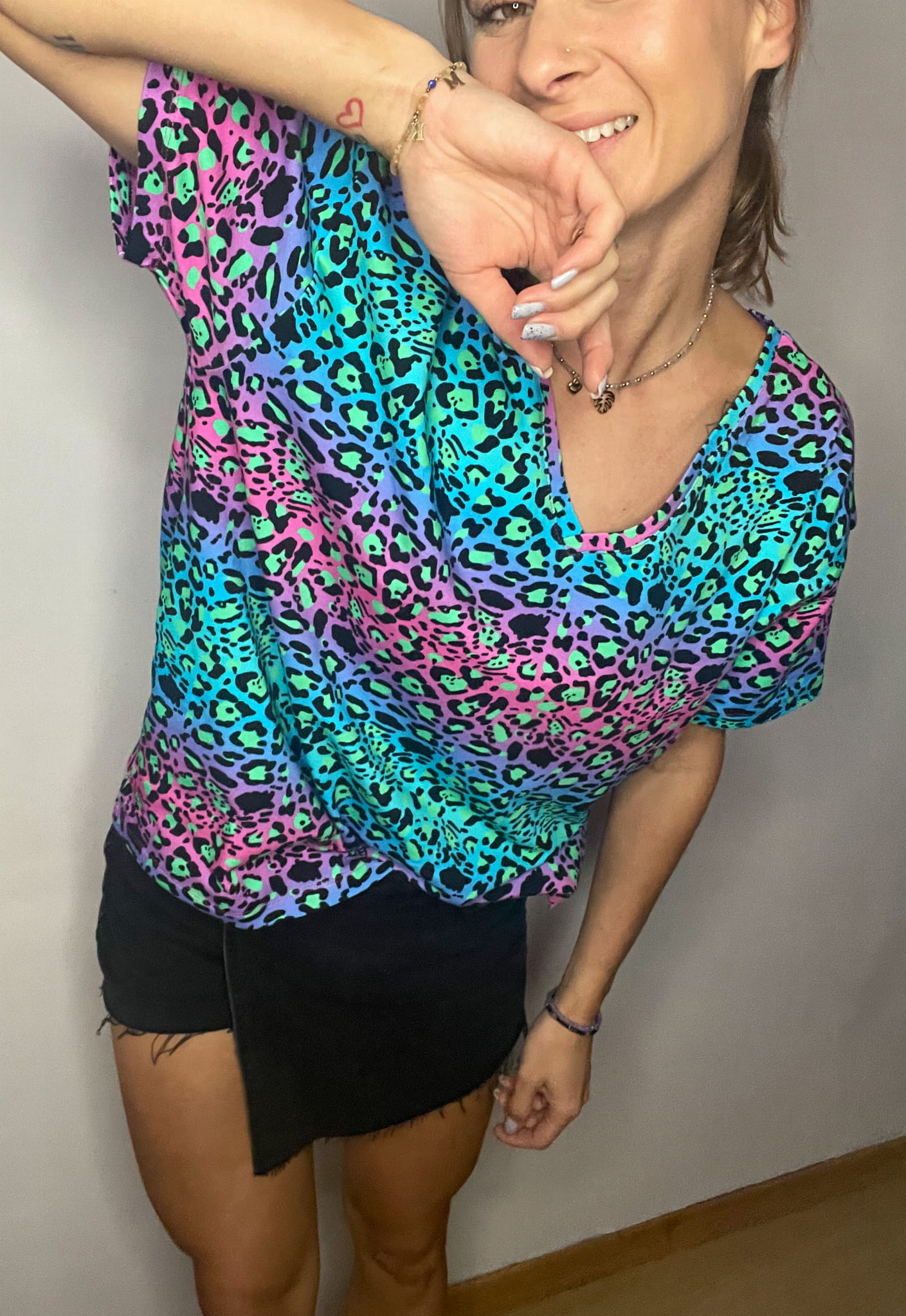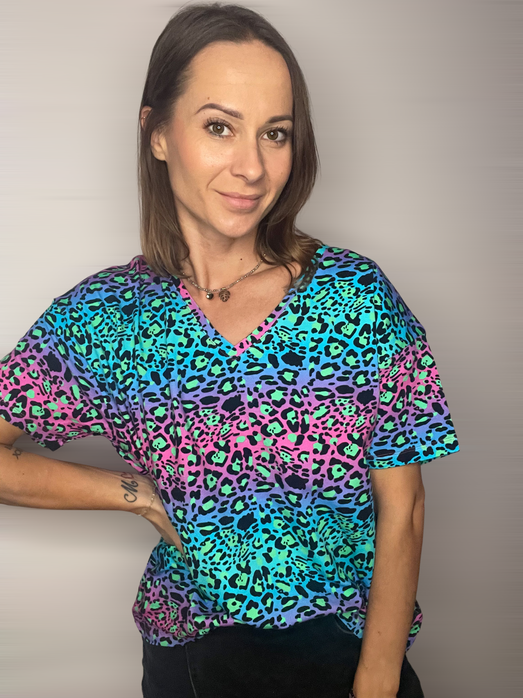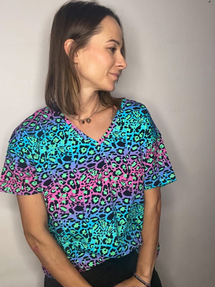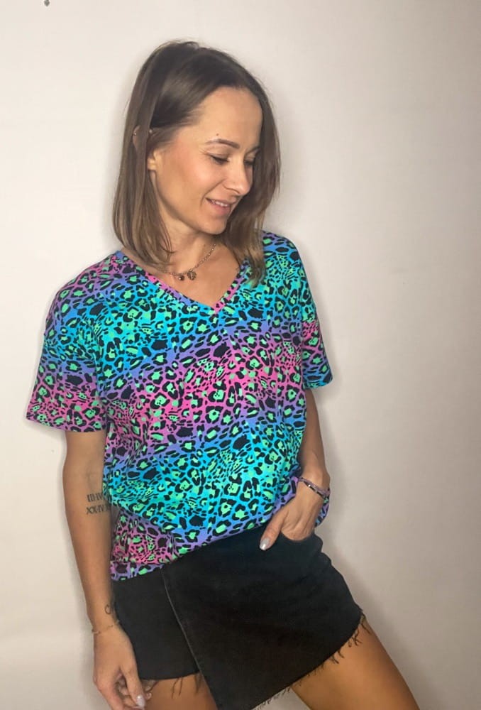 Koszulka damska o kroju oversize we wzór Cętki fluo niebieskie. Motywy zwierzęce są modnym printem. Krój v - neck odsłoni dekolt ale jeżeli nie lubisz takich fasonów to wybierz opcję klasyczną u-neck. Krój koszulki luźny, oversize. Wzór podkręca harmonijną stylizację dzięki swoim niebanalnym kolorom. Koszulka jest dłuższa niż standardowe tshrty więc swobodnie możesz ją zbluzować.