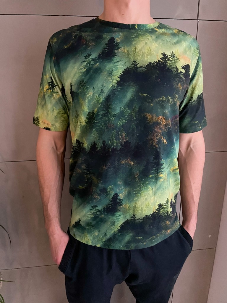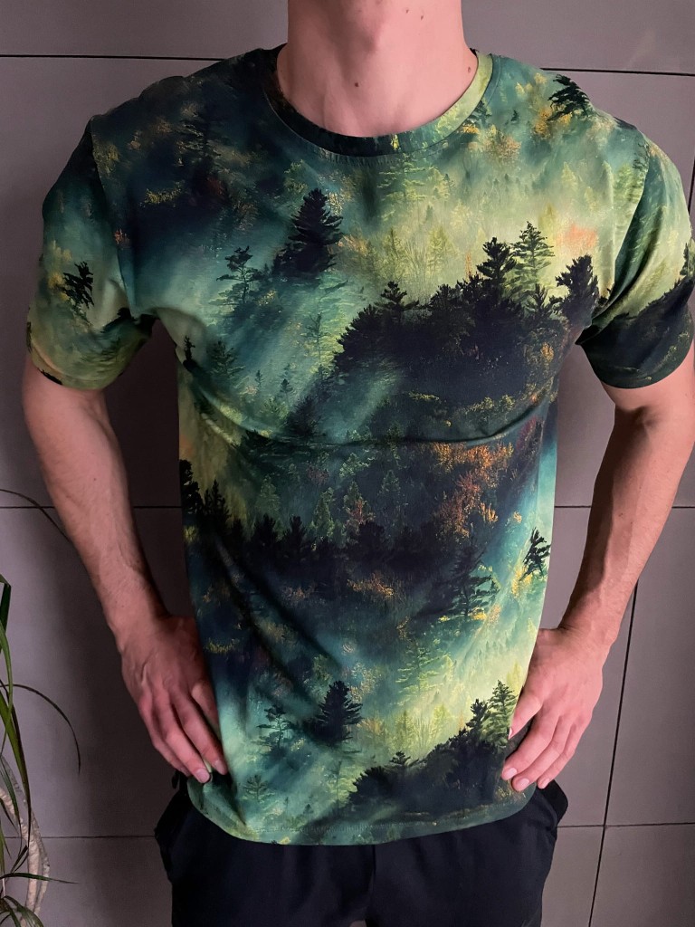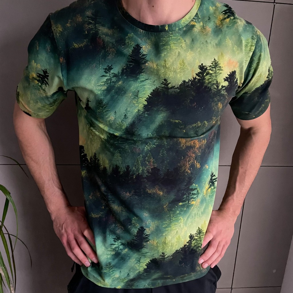 Koszulka męska w we wzór Zielony las. Wysoka jakość dzianiny w połączeniu z odpowiednim krojem daje efekt ulubionej koszulki. Tę samą koszulkę możesz zamówić w wersji dziecięcej tworząc wyjątkowy zestaw rodzinny.