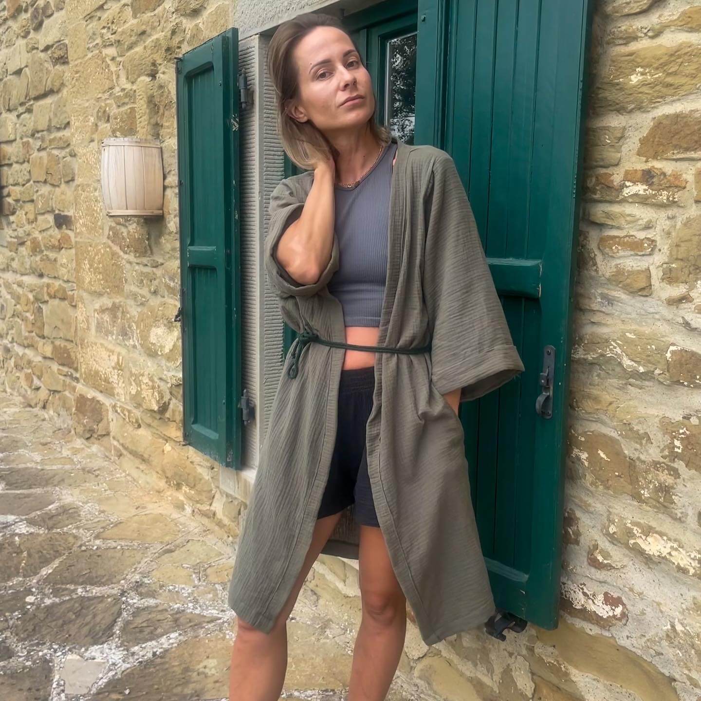 Muślinowe kimono Mrs. Thin to delikatne i lekkie ubranie, które emanuje subtelnością i elegancją. Wykonane z wysokiej jakości muślinu, które jest lekką i delikatną tkaniną zapewniającą wygodę i uczucie lekkości podczas noszenia. Jest idealnym wyborem na letnie dni, ponieważ zapewnia przewiewność i utrzymuje naszą skórę w komfortowej temperaturze.