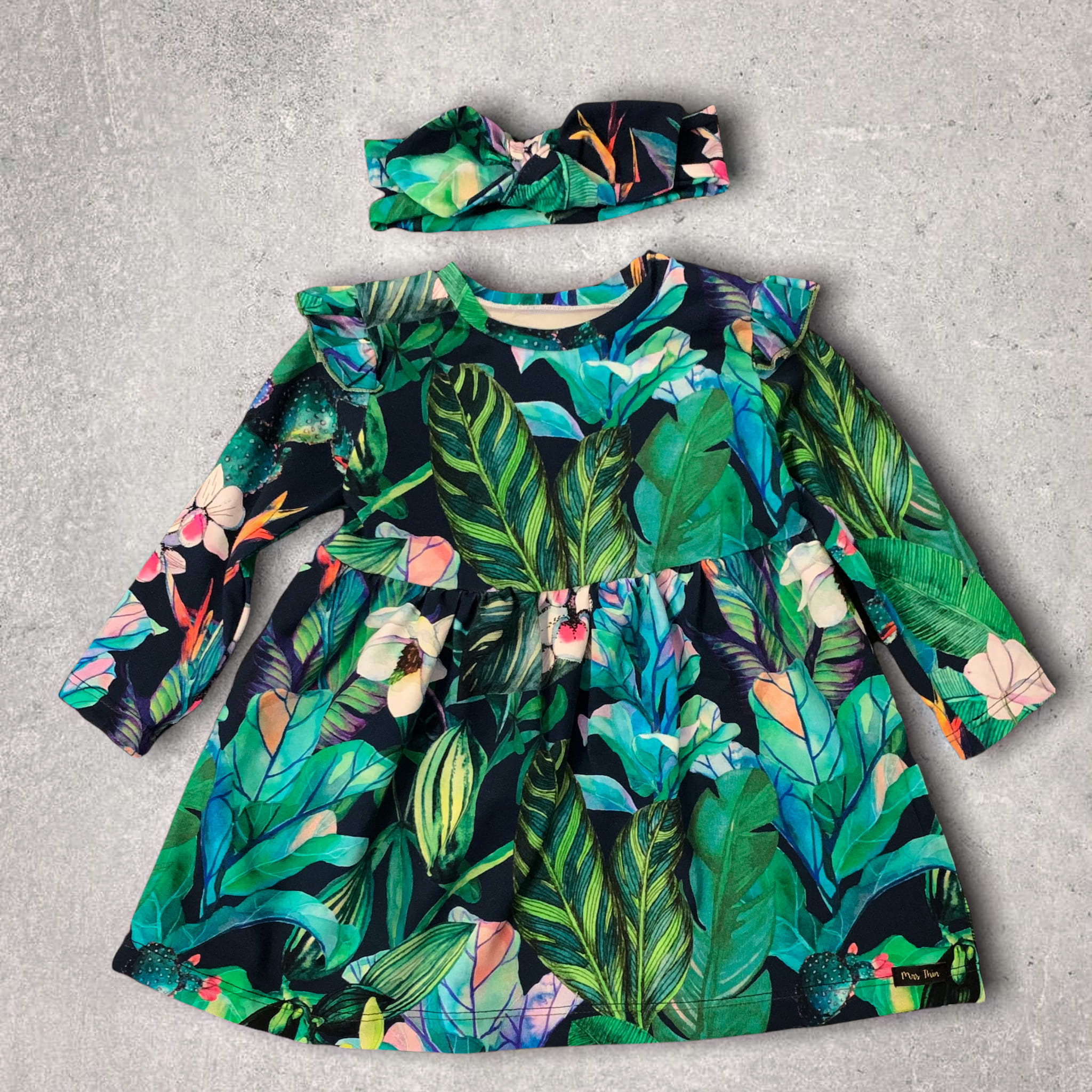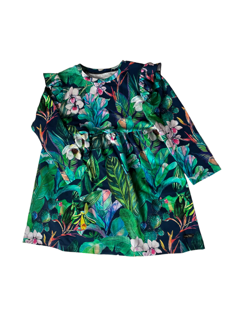 Sukienka JUNGLE uszyta jest z miłej w dotyku i rozciągliwej dzianiny typu jersey. Ramiona zdobią bufki, które nie przeszkadzają dziecku w trakcie zabawy i nie gniotą się pod okryciem wierzchnim. Do sukienki możesz dokupić opaskę - w duchu idei zero waste opaski szyte są z resztek materiału. W zgodzie z ekologią produkujemy mniej śmieci w procesie wytwarzania ubrań.