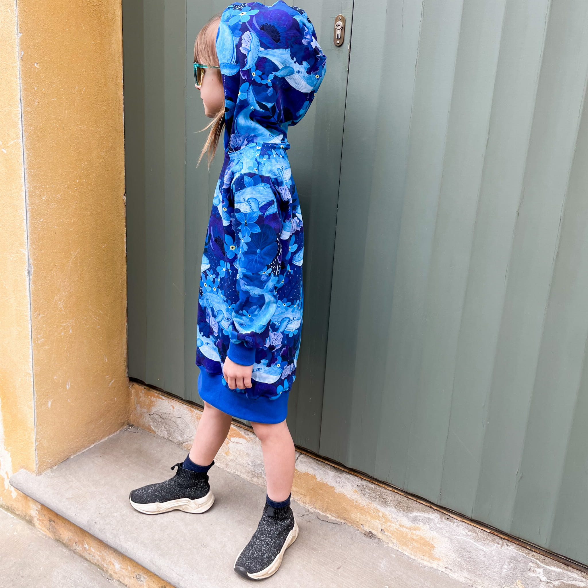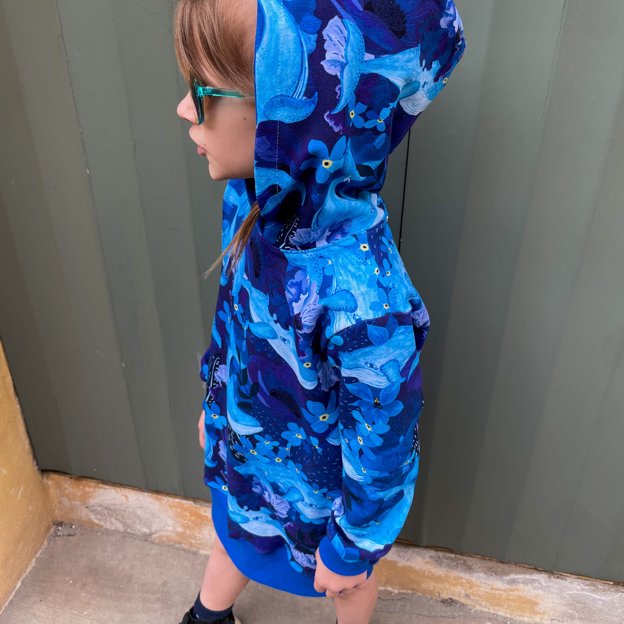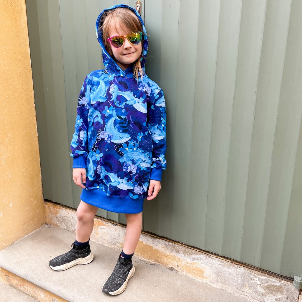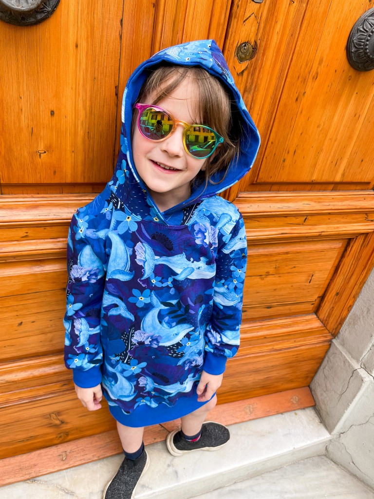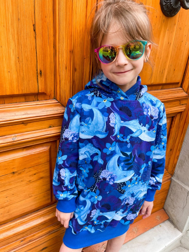 Dziewczęca sukienka z kapturem we wzór Wieloryby uszyta z miękkiego materiału dresowego, który zapewnia wygodę i swobodę ruchów. Dzianina jest delikatna dla skóry dziecka i zapewnia komfort noszenia przez cały dzień.