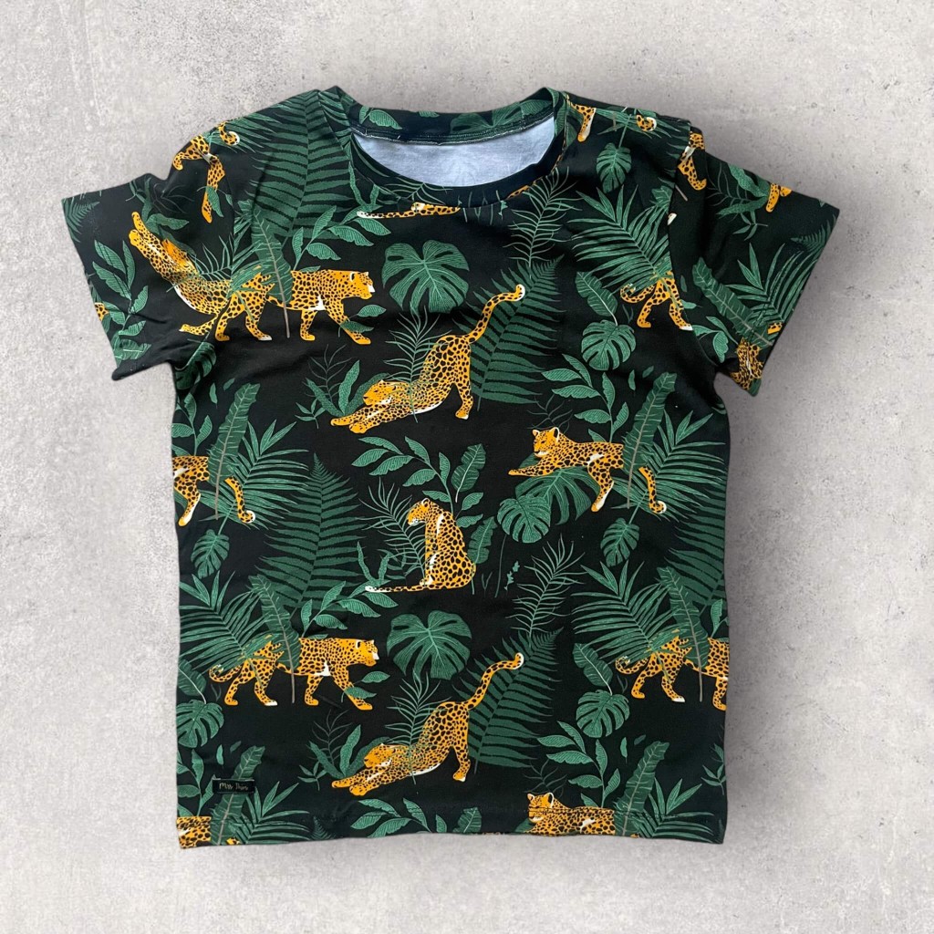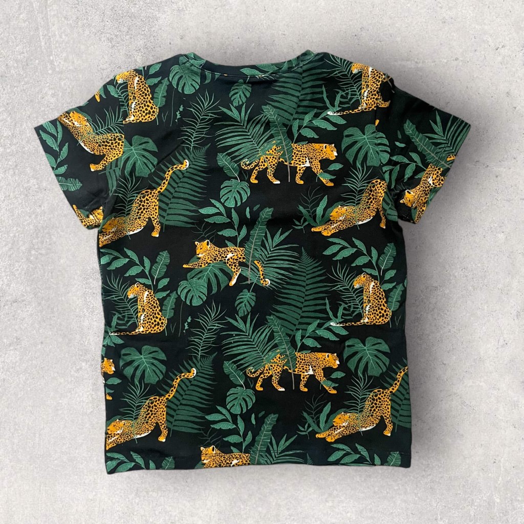 Koszulka w Gepardy to połączenie dzikich kotów z urokiem egzotycznych kwiatów i liści tropikalnej dżungli. Wzór ten tworzy harmonijną i przyjemną kompozycję, która zachęca do marzeń o odległych przygodach.