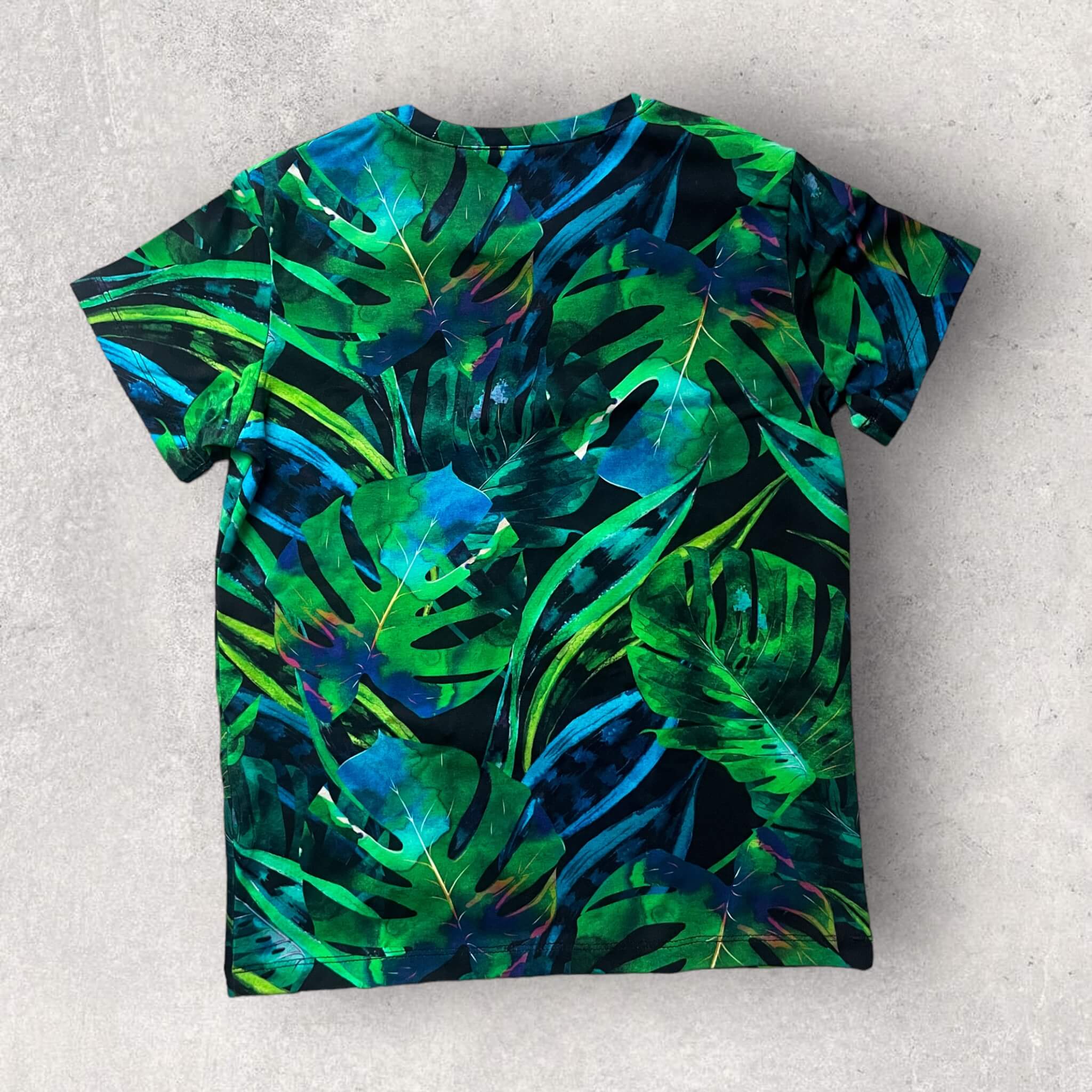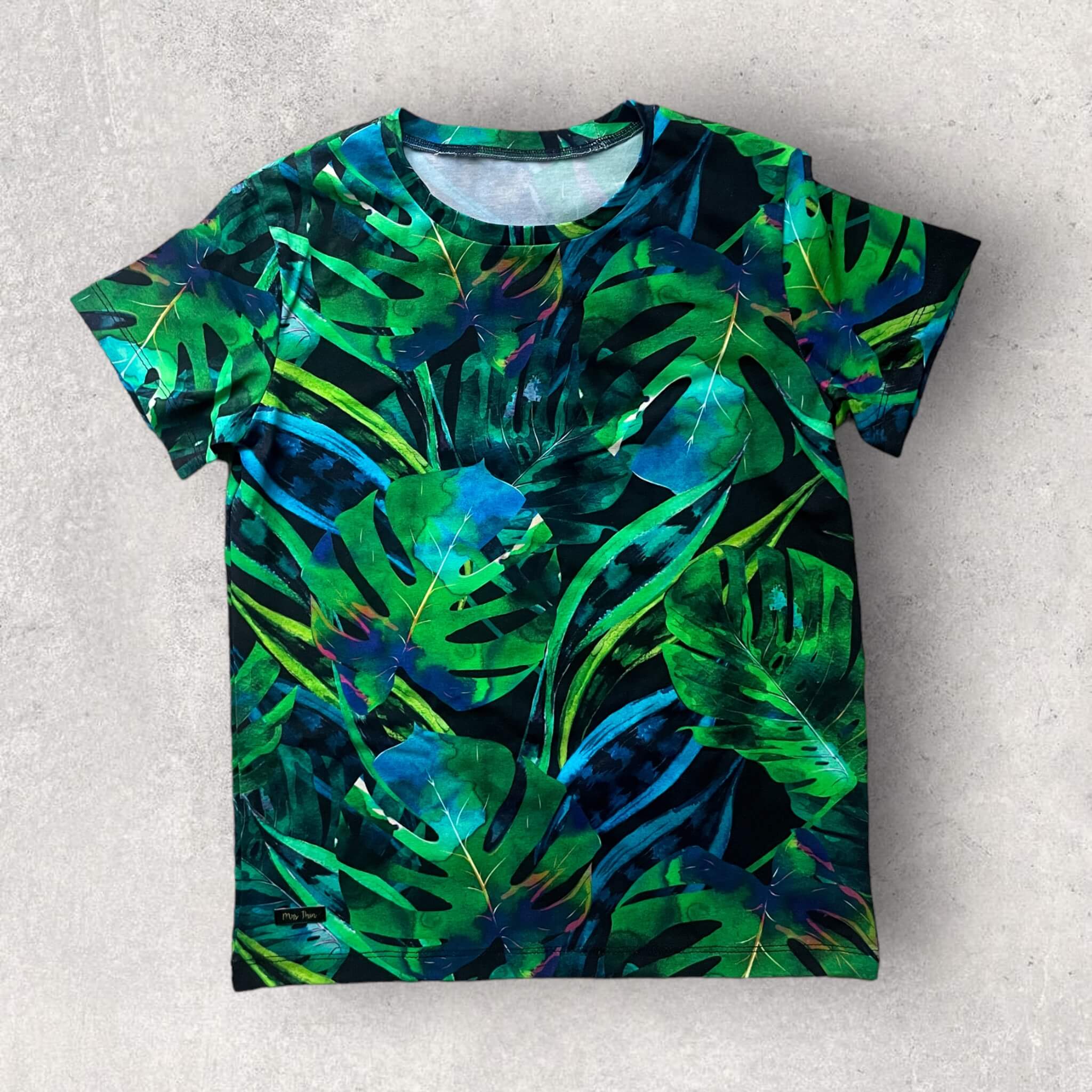Koszulka Monstera Akwarela. Zdominowana zielonym kolorem, uszyta z miękkiej dzianiny typu jersey.