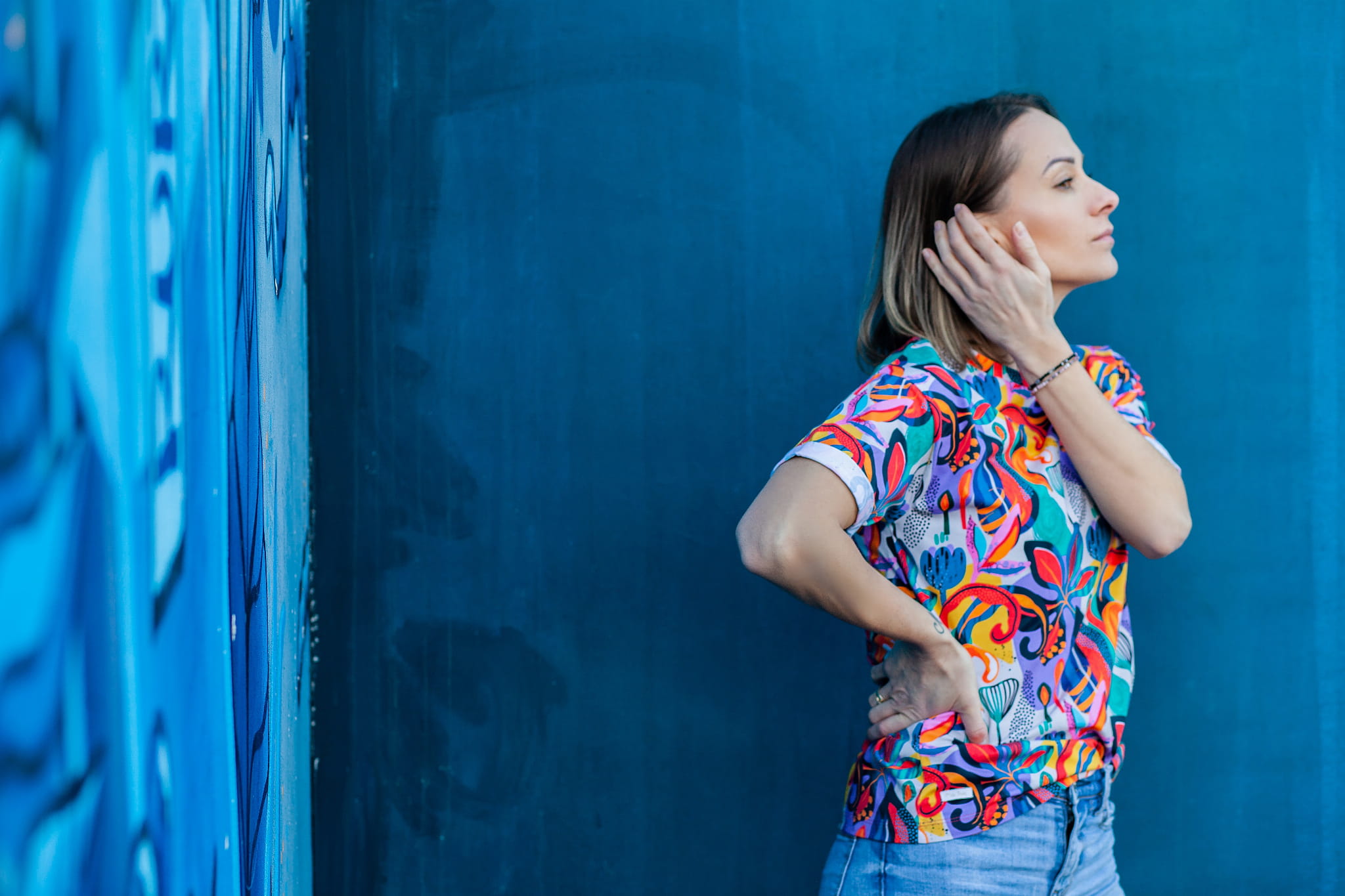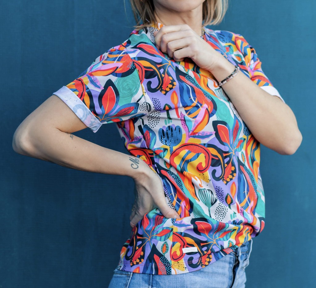 Luźna koszulka z podwiniętym rękawkiem. Tym razem rękaw został wywinięty w drugą stronę aby przełamać pomarańczowe barwy surową bielą. Wzór charakterystyczny, mocno ekspresyjny. T-shirt, który założysz do jeansów by móc stworzyć niezobowiązującą stylizację ale i pod jednolitą marynarkę. Na randkę lub na rower - zapewniam, że będzie Ci w nim wygodnie wszędzie. Przyjemna, rozciągliwa bawełna w abstrakcyjny print doda świeżości wiosennym stylizacjom.