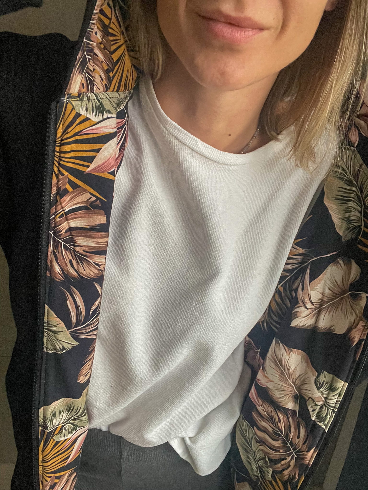 Zapięcie na zamek pozwala nosić go na wiele sposobów – od szczelnego otulenia się po nonszalanckie rozpięcie. Kieszenie boczne pomieszczą telefon, klucze lub dłonie, gdy zrobi się chłodniej. Długie czarne ściągacze przy nadgarstkach zatrzymują ciepło i dodają streetwearowego sznytu.