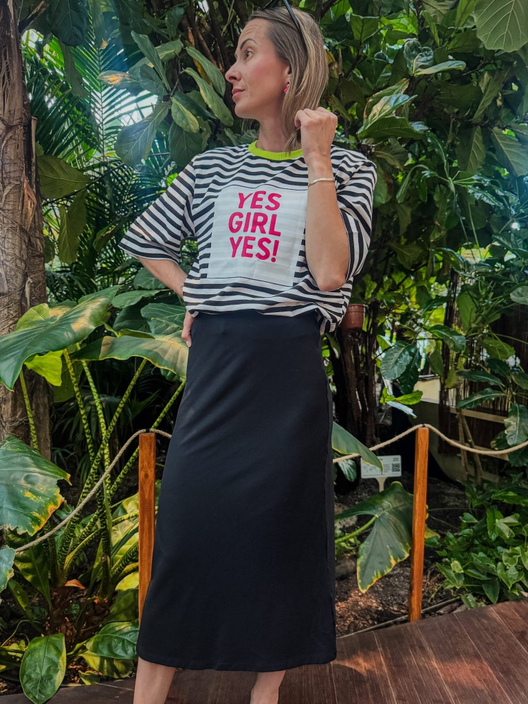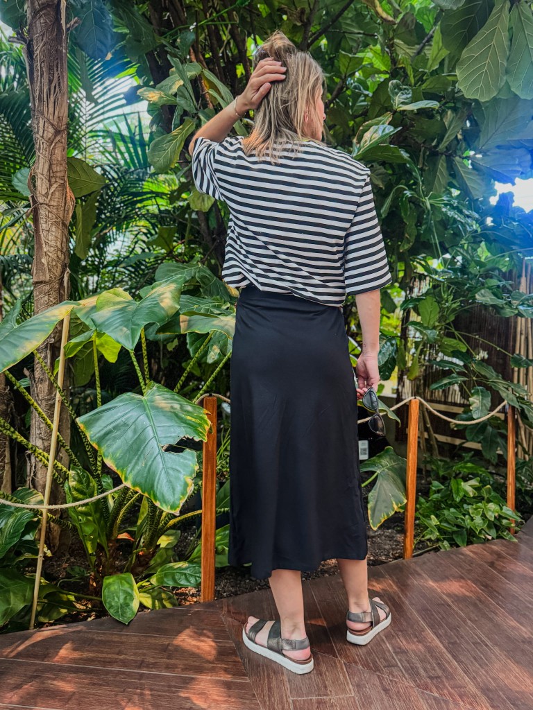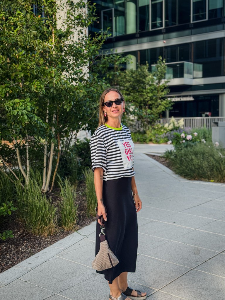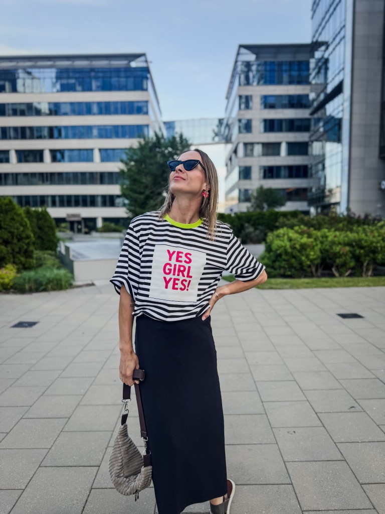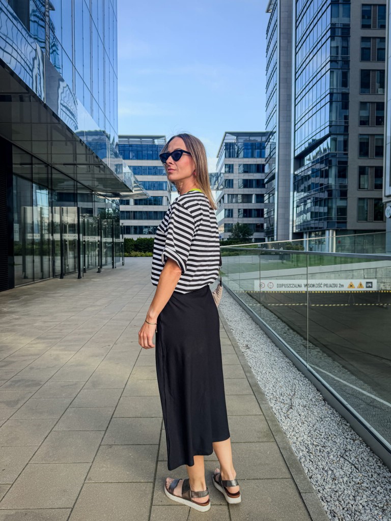 Cięcie po skosie sprawia, że materiał pięknie się układa, miękko opływając biodra i łydki. Długość midi – do połowy łydki – balansuje między luzem a kobiecą elegancją. Nie ma tu zbędnych detali – brak kieszeni, brak przesady – tylko czysta forma i wygoda, która zostaje z Tobą od rana do wieczora.