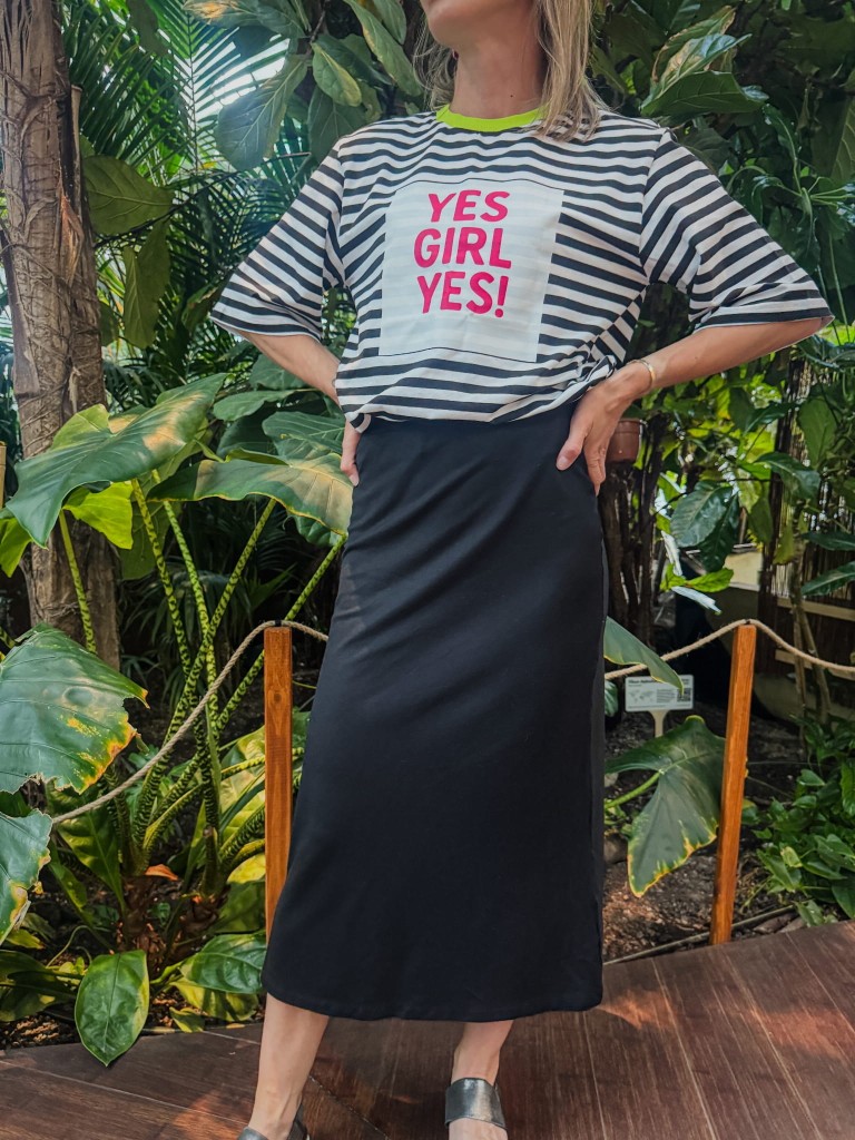 Spódnica ma szeroką gumkę w pasie, która dobrze trzyma fason, ale nie uciska. To projekt, który założysz do t-shirtu i trampek, ale też do koszuli i botków – zawsze tak, jak lubisz najbardziej.