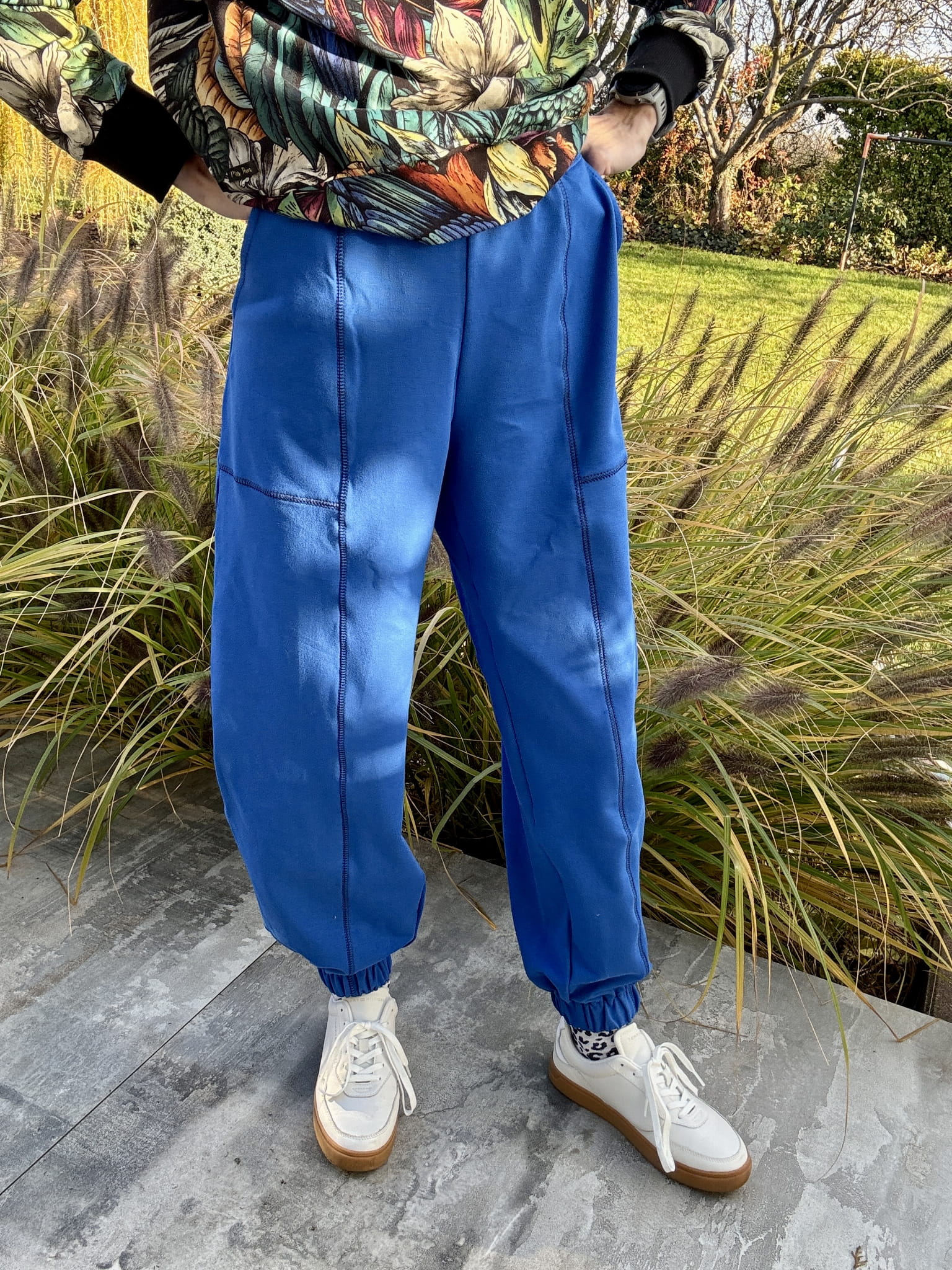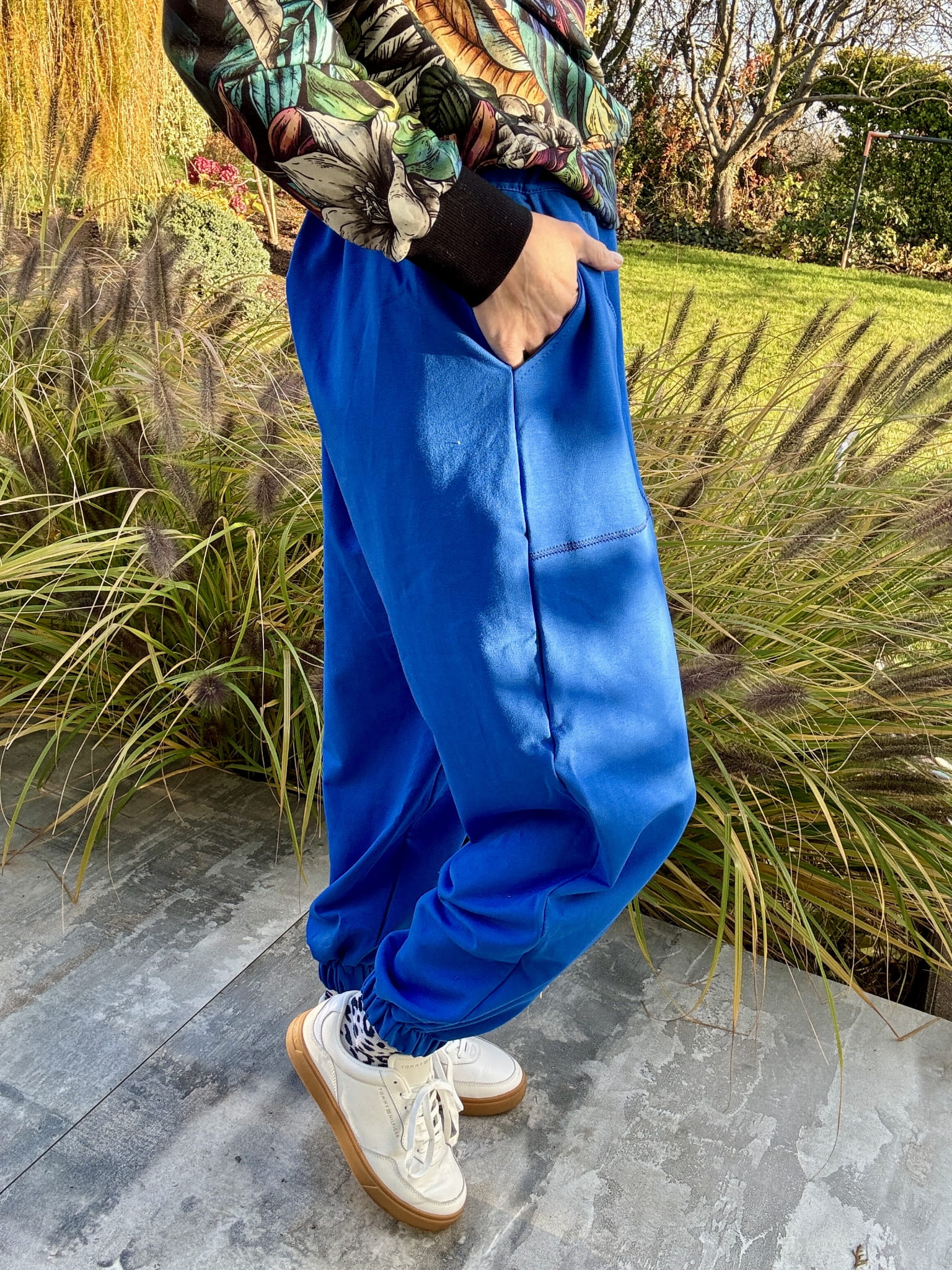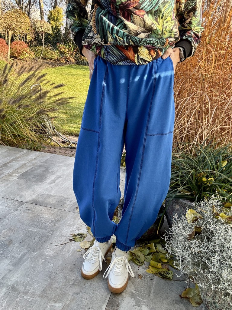 Ich charakter nadaje nogawka typu balloon — delikatnie zaokrąglona i zwężana ku dołowi, z miękką linią, która dodaje sylwetce lekkości i nowoczesnego kształtu. Dół nogawki zakończony gumką tworzy subtelny mankiet, dzięki któremu spodnie świetnie układają się na każdym typie figury.