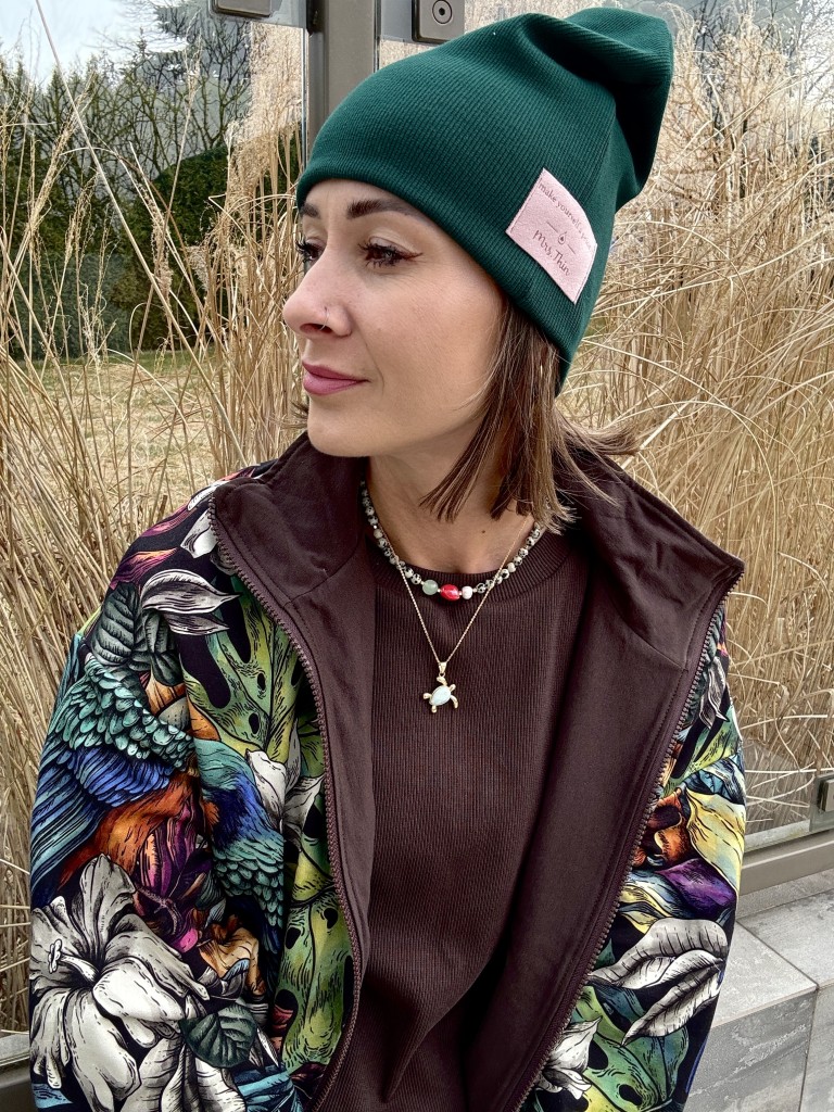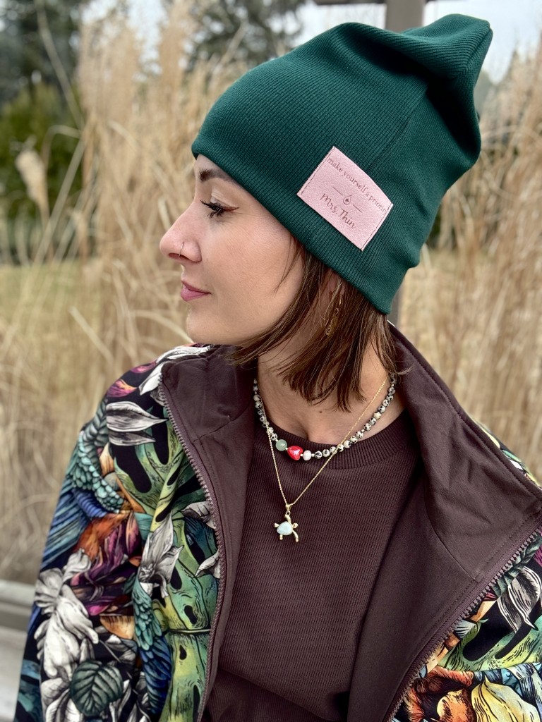 Damska czapka smerfetka od Mrs. Thin w odcieniu butelkowej zieleni to minimalistyczna forma z wyraźnym detalem. Welurowa naszywka w kolorze różu z hasłem „Make Yourself a Priority” nadaje całości osobistego charakteru — to subtelny manifest, który możesz mieć zawsze przy sobie.